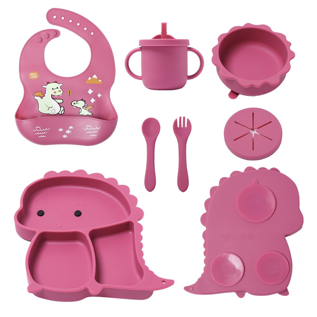 Silicone Baby Feeding Set, Baby Led Weaning Supplies, Eating Essentials Utensils with Suction Plate and Bowl, Pocket Bib, Sippy Cup with Lid, Forks|Baby & Toddler