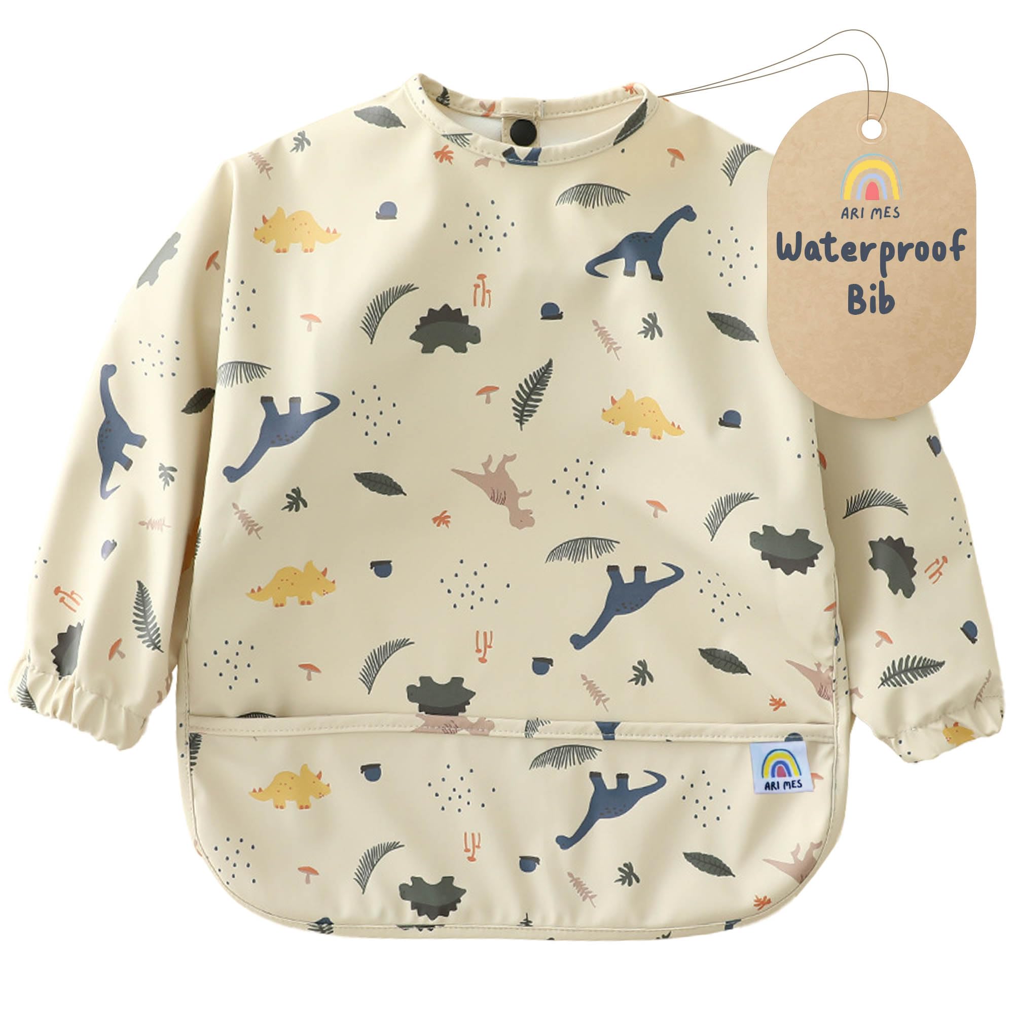 ARI MES Waterproof Long Sleeve Baby Bib for Eating-Dinosaur Pattern, Large-Toddler Smock with Catch-All Pocket, BPA Free, Machine Washable, Wearable|Baby & Toddler