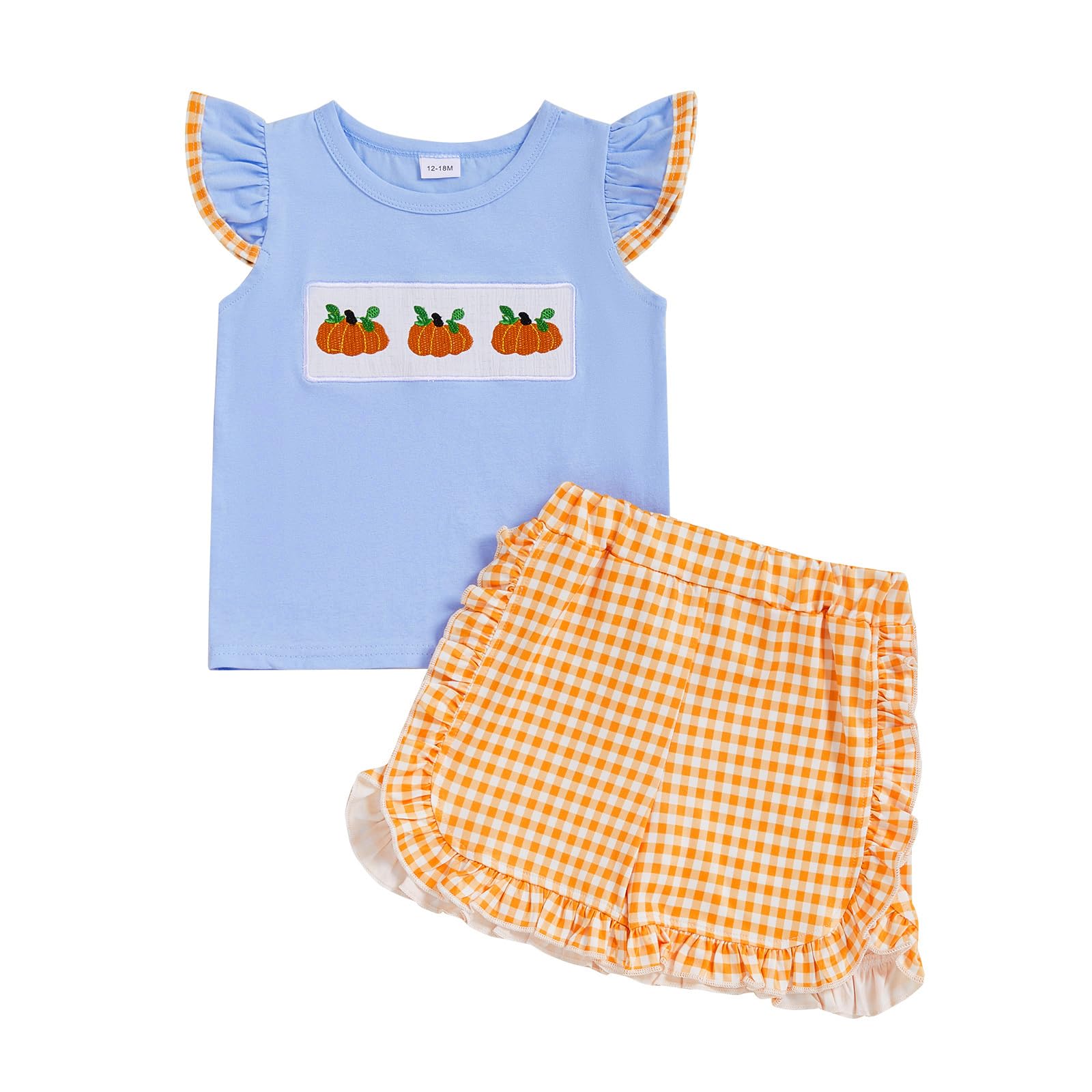 Karuedoo Toddler Baby Girl Halloween Outfit Pumpkin Embroidery Flutter Sleeve T Shirt Top and Plaid Ruffle Shorts Set|Clothing