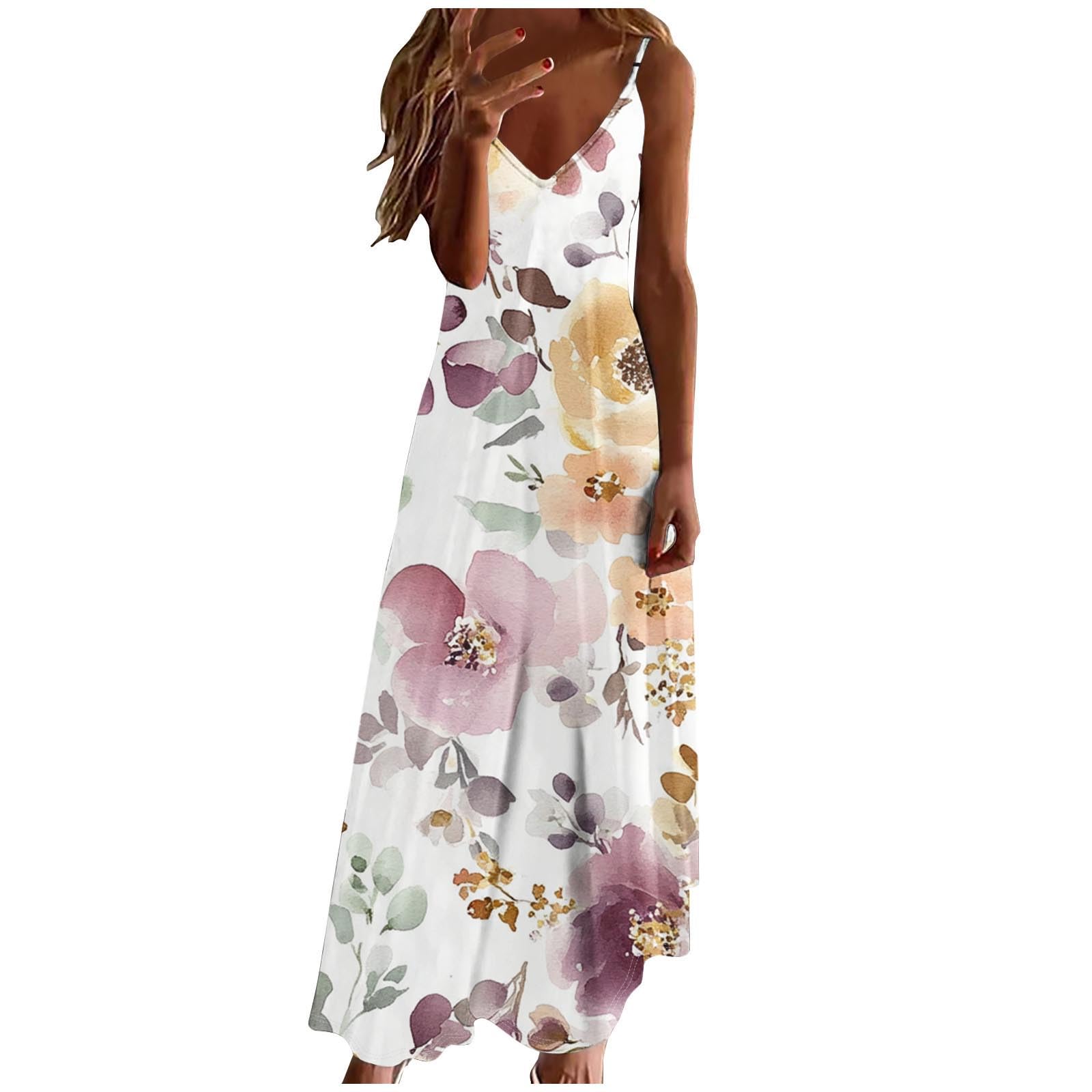 Women Floral Spaghetti Strap Sundress Casual Summer Maxi Dress V Neck Sexy Boho Dresses Trendy Beach Outfits 2026|Clothing