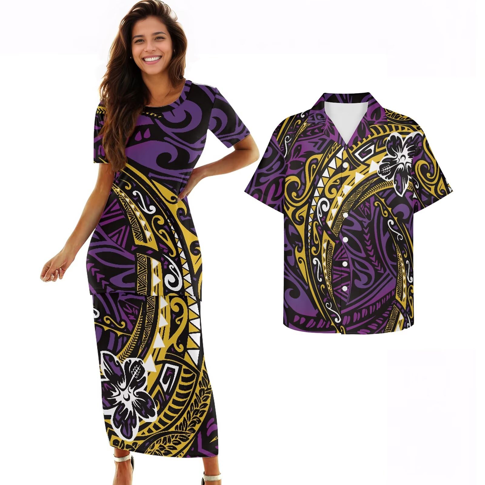 Cjfognsoa Polynesian Couples Matching Outfits Samoa Puletasi Women's Dresses and Luau Men's Shirts|Clothing