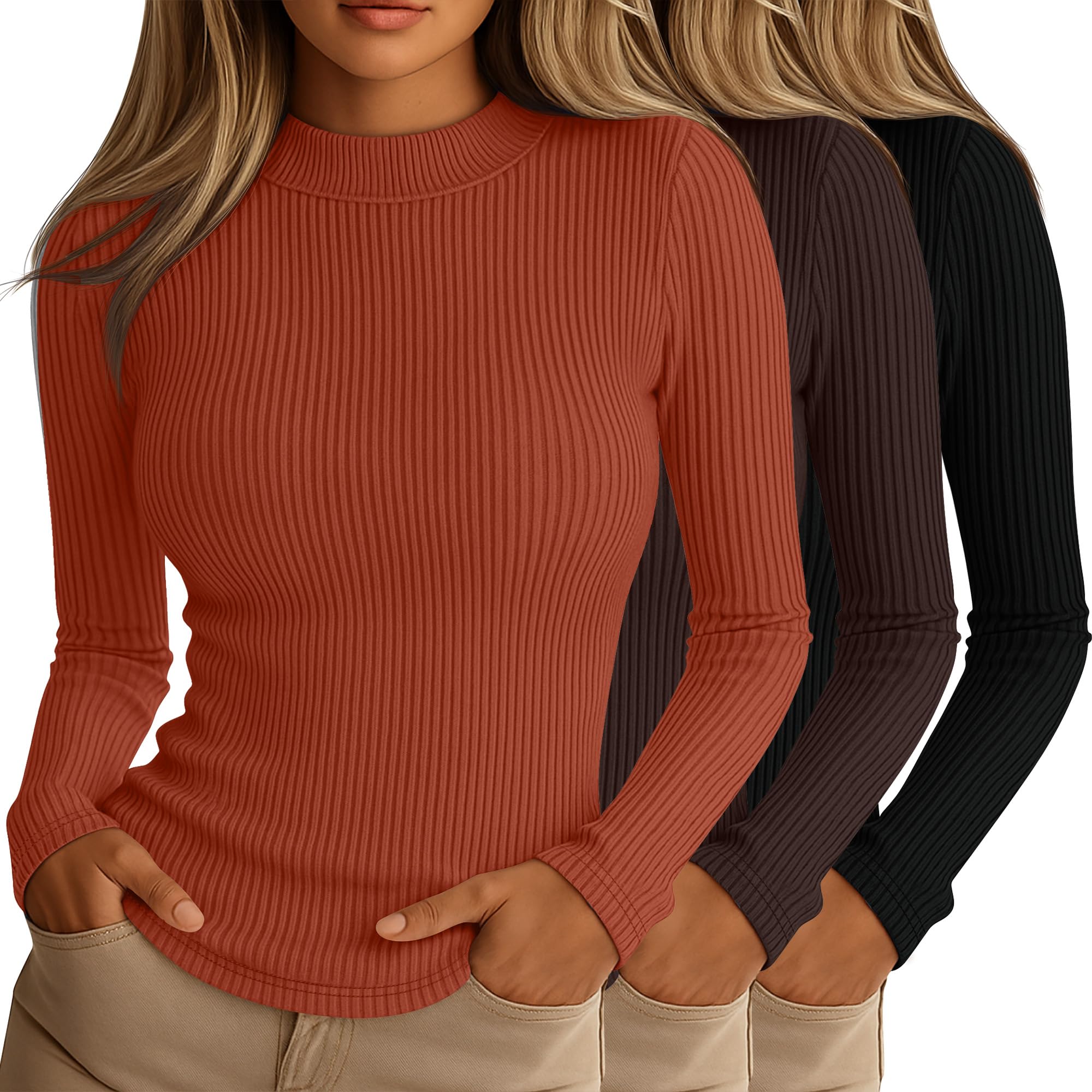 Riyiper 3 Pack Women's Ribbed Shirts, Mock Turtleneck Long Sleeve Tops Slim Fitted Undershirts Casual Basic Layering Tees|Clothing