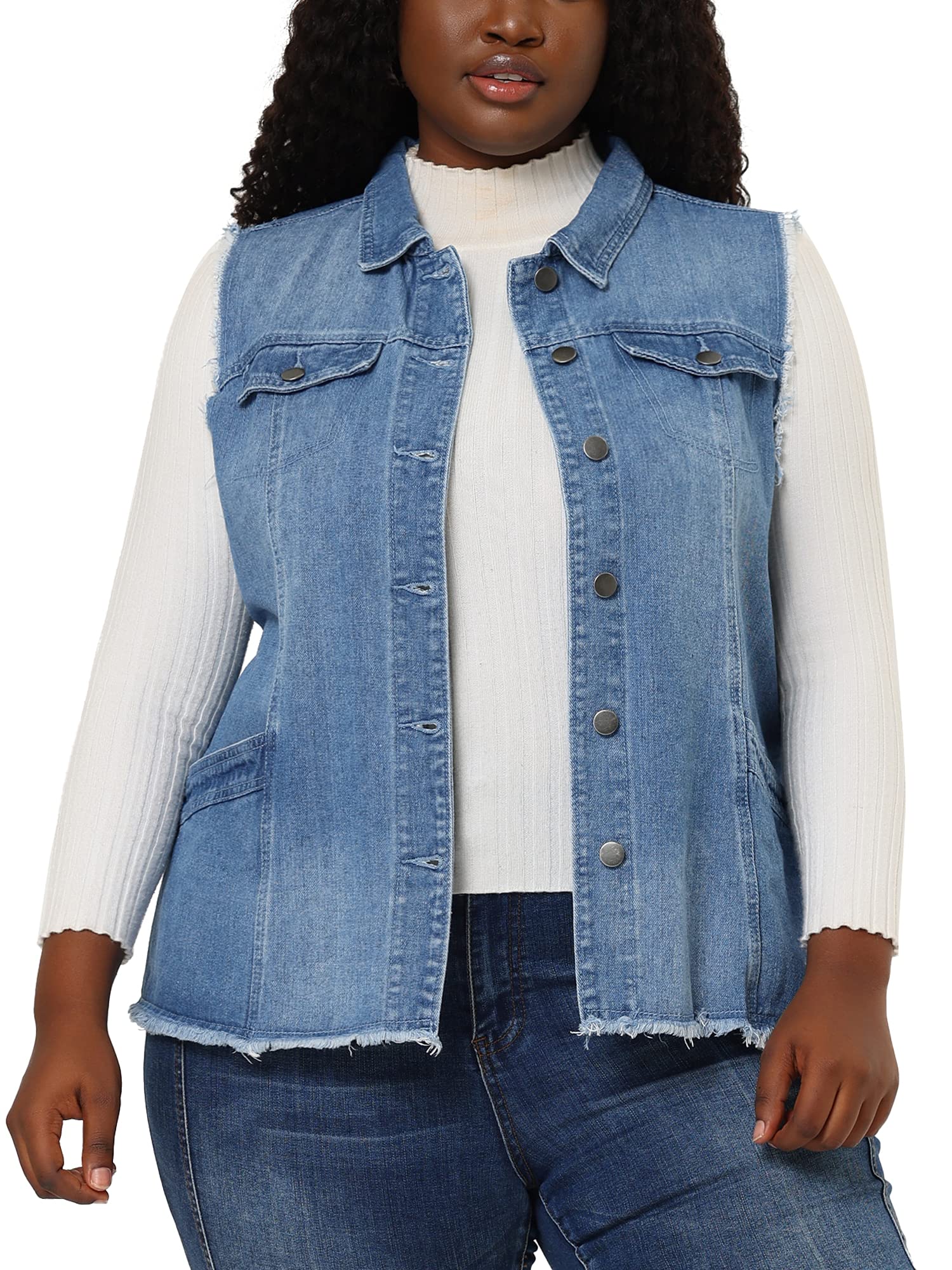 Agnes Orinda Denim Jackets for Women 2025 Plus Size Button Front Lapel Frayed Washed Sleeveless Long Jean Vest|Clothing