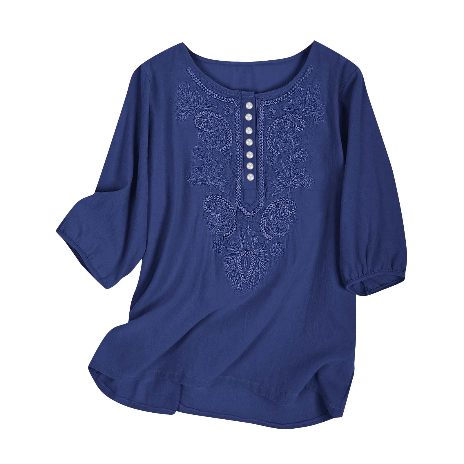 Womens Cotton Linen Tops Button Short Sleeve Shirts Summer Loose Crew Neck Casual Boho Top Vintage Embroidered Blouse|Clothing