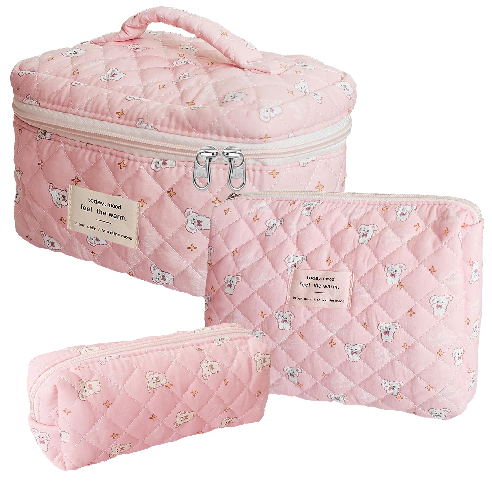 Cozomga Cute Cotton Quilted Makeup Bag Set, Large Travel Cosmetic Bag for Women, Big Make Up Bag with Toiletry Organizer, Aesthetic Storage for Daily|Health & Beauty