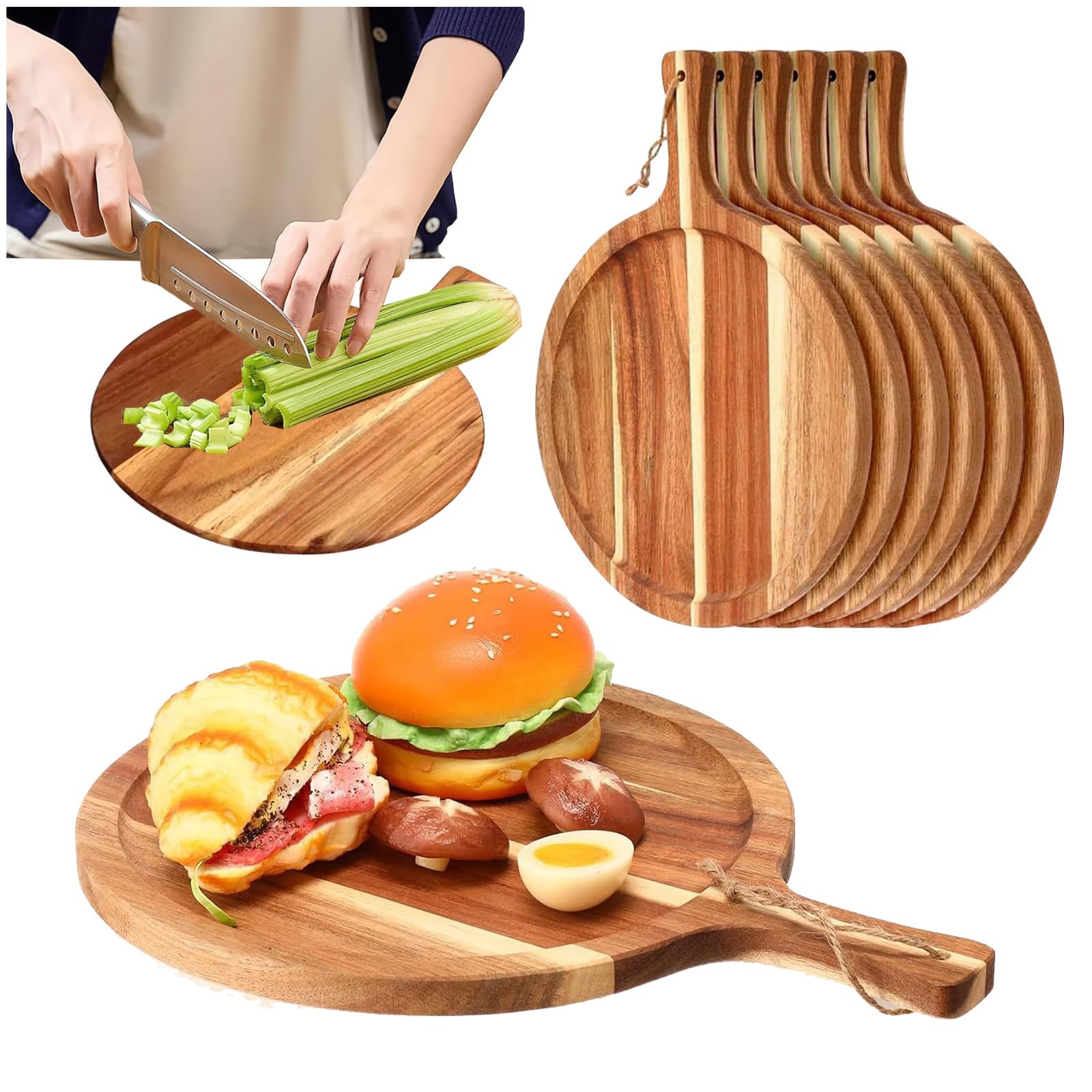 6 Pcs Round Cutting Board with Handle, Pizza Wooden Charcuterie Boards, Acacia Wood Chopping Board, Wood Serving Board for Kitchen, Cheese, Fruit,|Kitchen & Dining