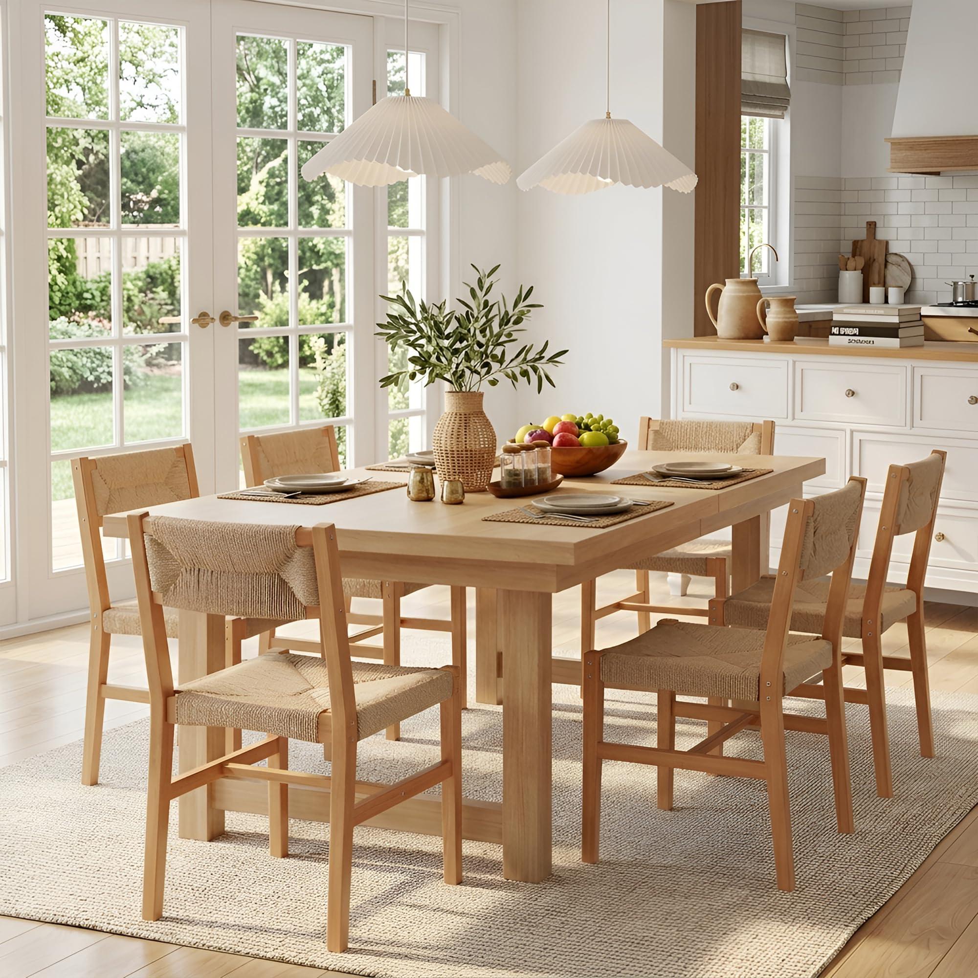 Mid Century Modern Rattan Dining Chairs Set of 6, Natural Beechwood Kitchen Chairs Farmhouse Woven Dining Room Chairs, Armless Boho Cane Wicker Chair|Kitchen & Dining