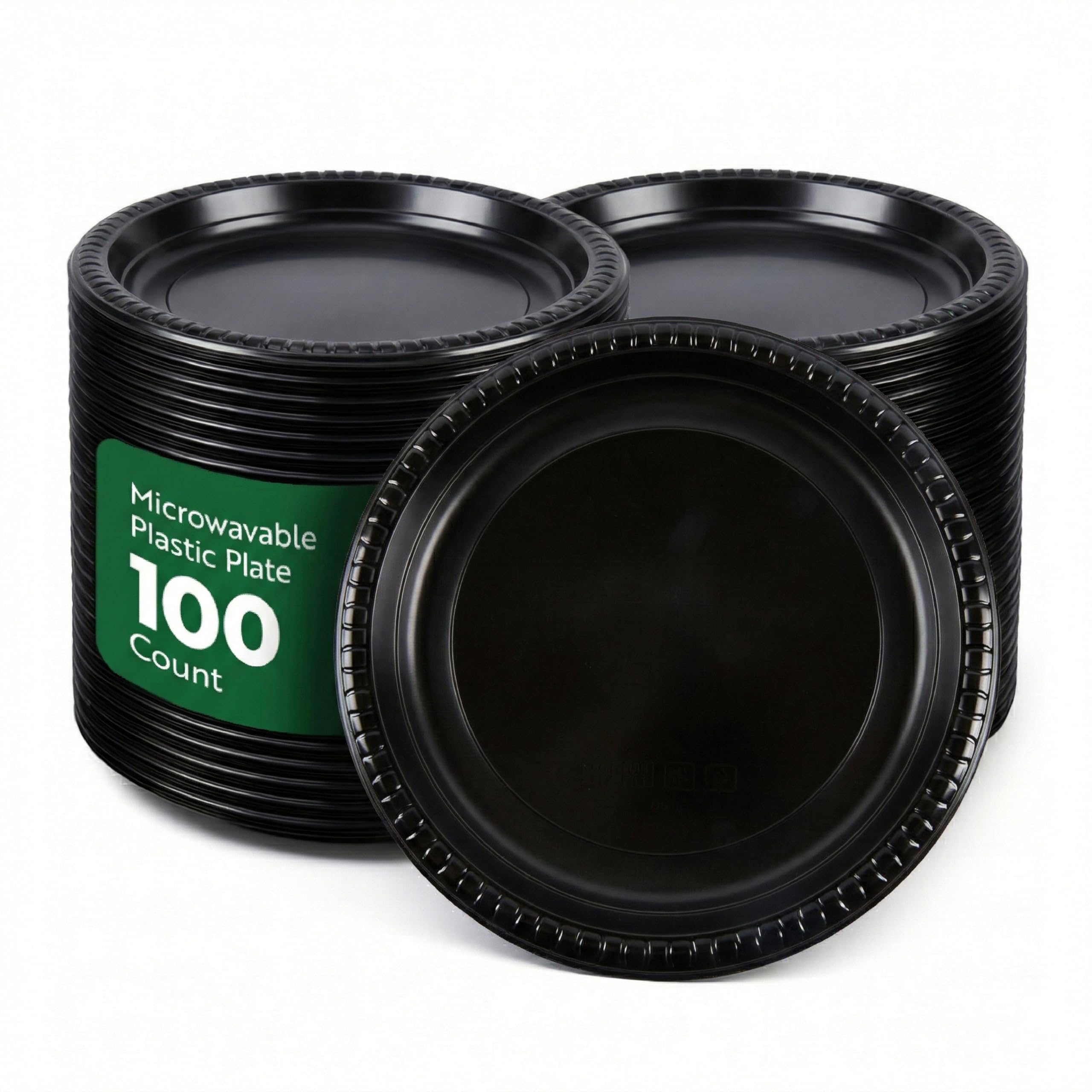 RW Base 10.4 Inch Microwavable Food Plates, 100 Round Plastic Plates - Disposable, Heavy-Duty, Black Plastic Dinner Plates, Serve Hot And Cold Foods,|Kitchen & Dining