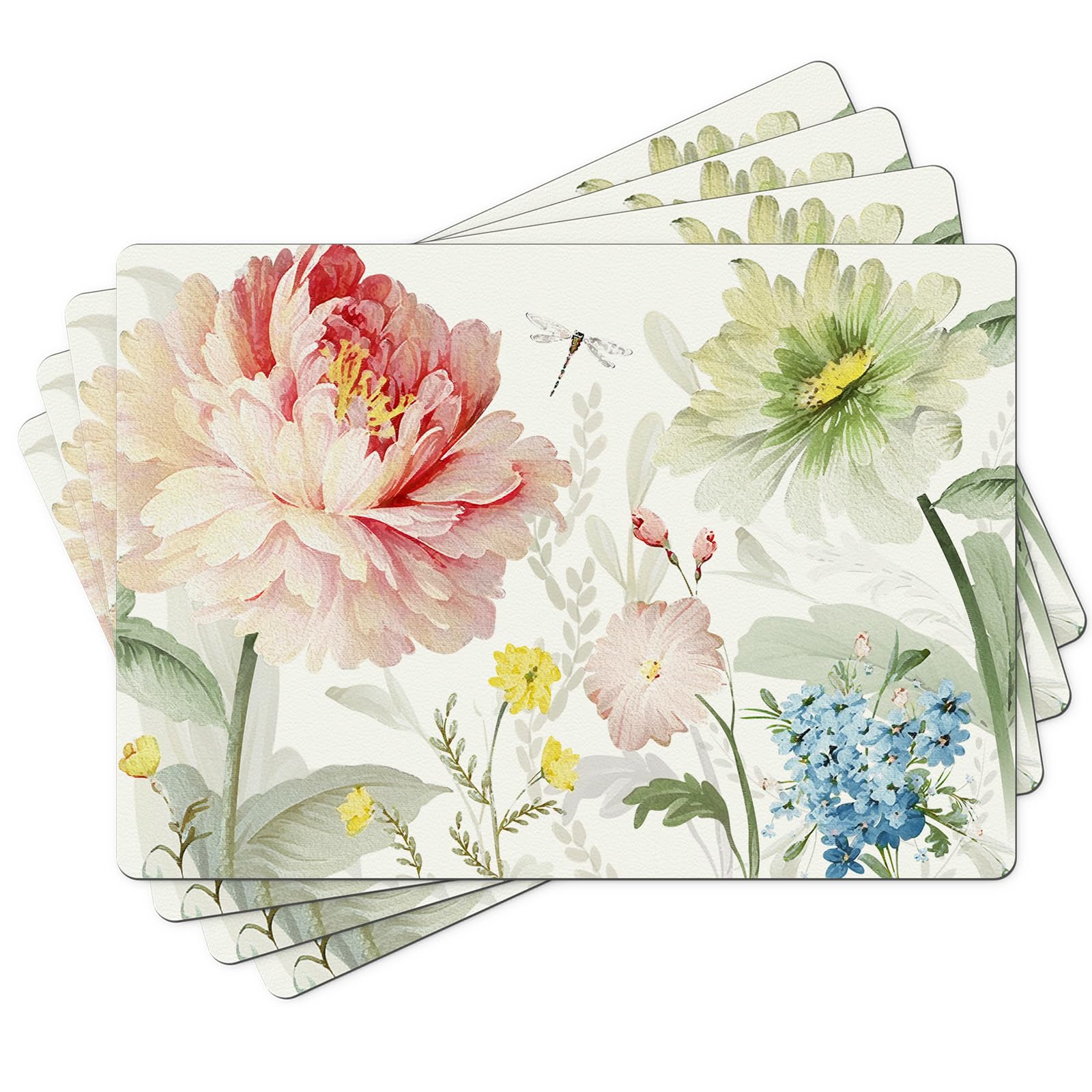 Blooming Peonies Placemats Set of 4, Spring Floral Faux Leather Placemat for Kitchen Dining Table, Heat Resistant Wipe Clean Non-Slip Washable Table|Kitchen & Dining