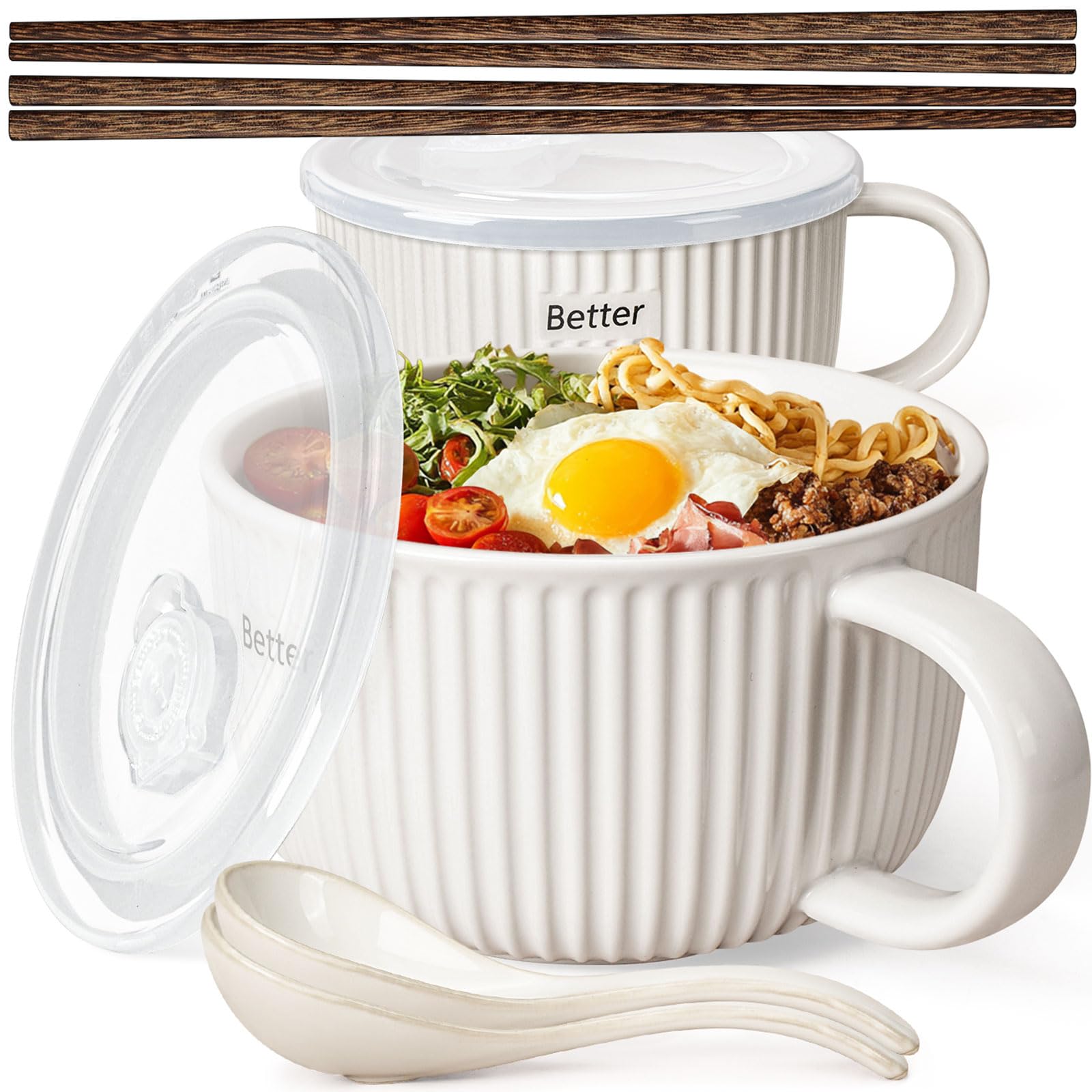 Artena 38 oz Soup Bowls with Handles, Lids, Spoons & Chopsticks – 6 Inch Large Microwave Safe Ceramic Ramen Bowls, Soup Mugs & Cereal Bowls for|Kitchen & Dining