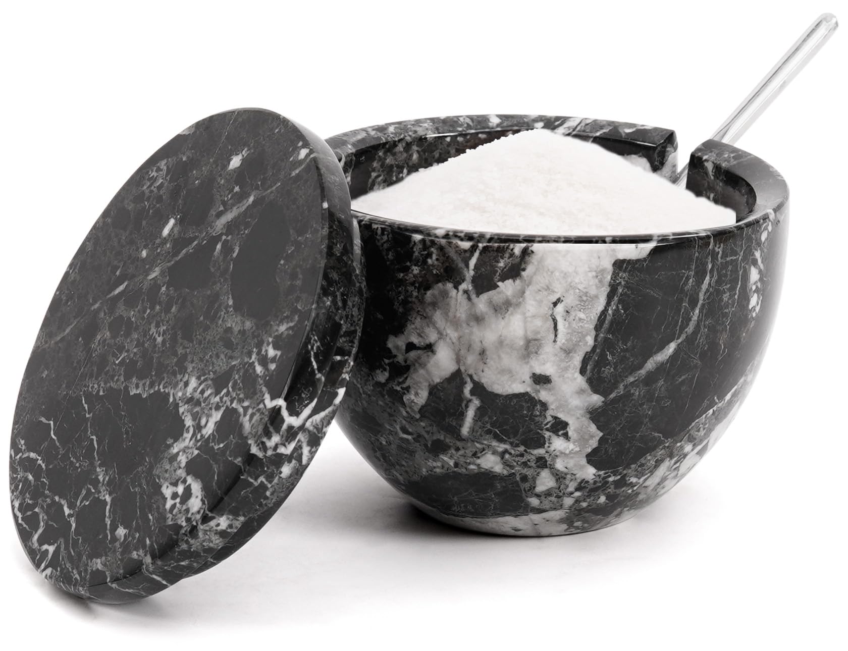 MARBLOUS KRAFTS Marble Salt Cellar with Lid and Spoon Black Zebra 3 x 4 Spice Container for Kitchen Countertop, 4.7 oz, Perfect for Sugar Candy Bowl|Kitchen & Dining