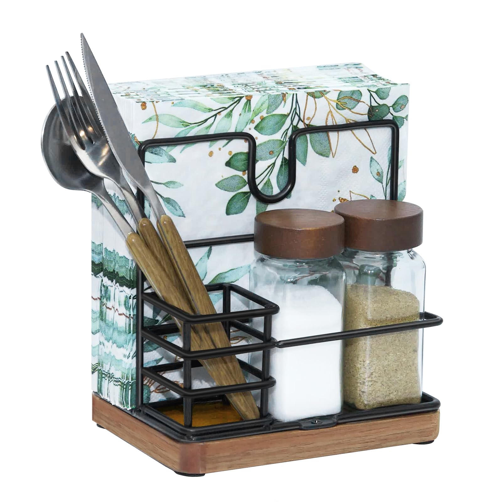 Napkin Holder for Table, Standing Napkin Holder with Salt and Pepper Shakers, Acacia Wood Base, Iron Build, for Kitchen, Dining Room, Outdoor Use(|Kitchen & Dining