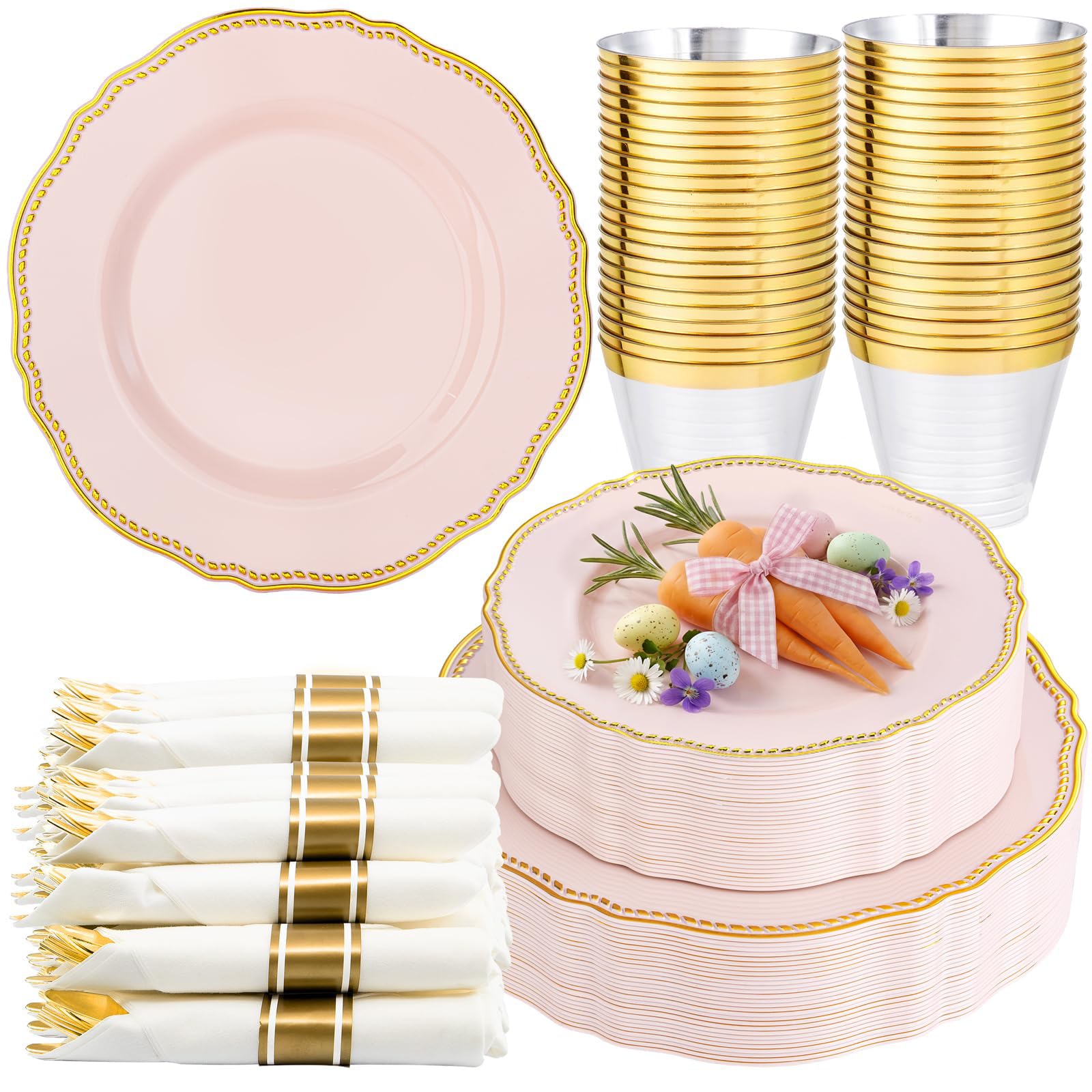 Hioasis 175pcs Pink and Gold Plastic Plates - Pink Plastic Dinnerware Set Includes 25 Dinner Plates, 25 Dessert Dinnerware, 25 Cups, 25 Napkins|Kitchen & Dining