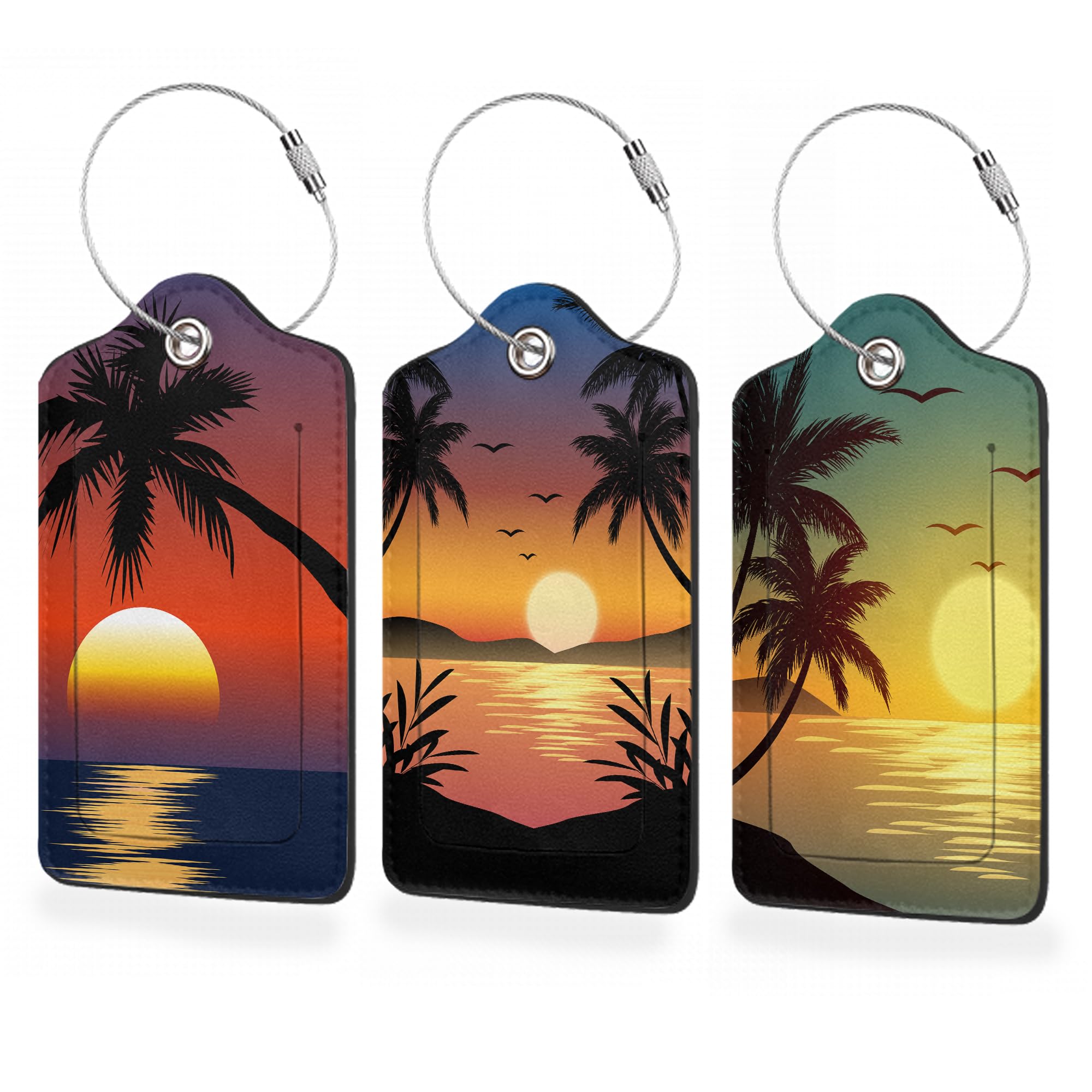 3 Pack Luggage Tags,Tropical Palm Sunset Sea Beach PU Leather Luggage Tags for Suitcase,Name ID Labels with Privacy Cover Suitcases and Metal Loop for|Luggage & Bags