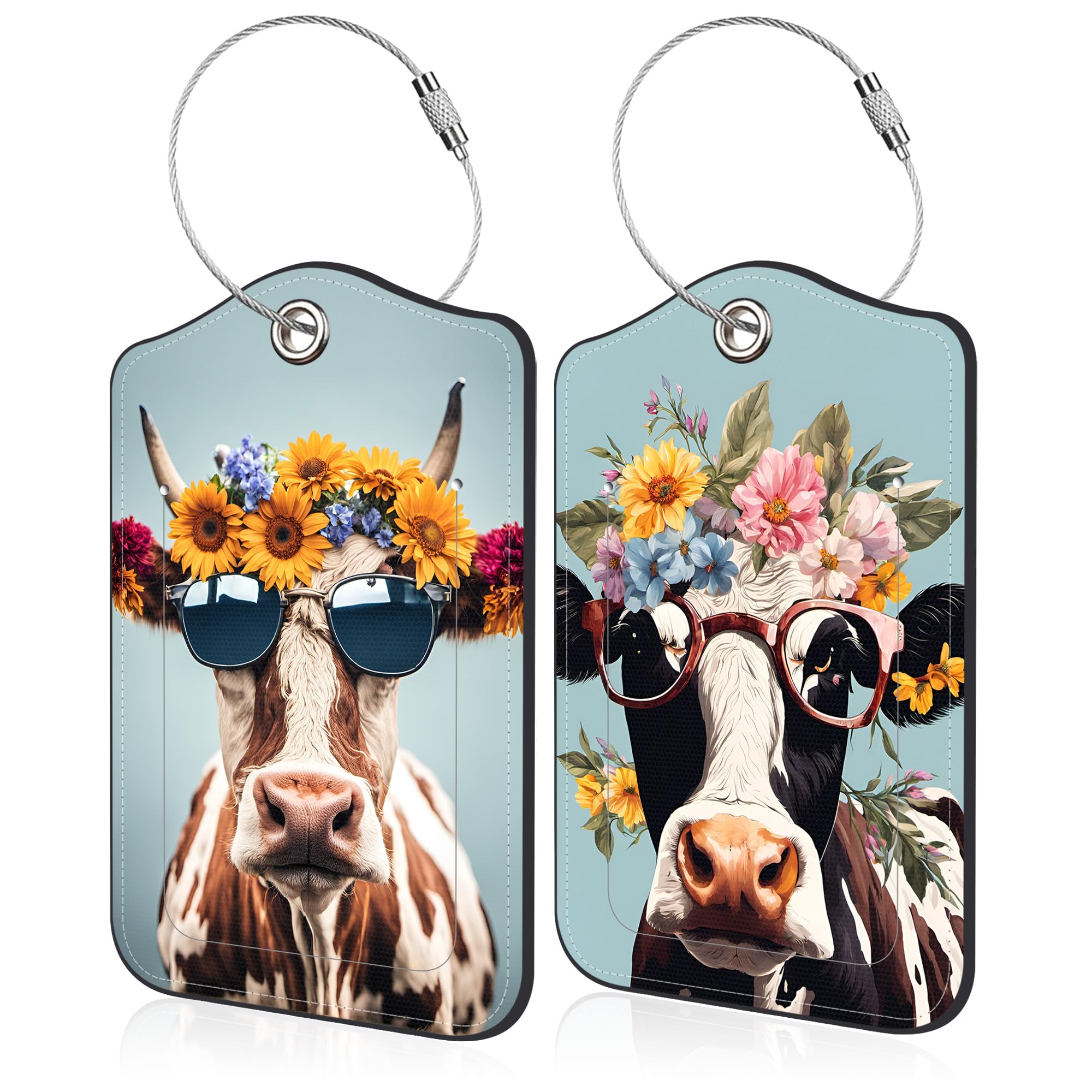 2 Pack Luggage Tag for Suitcase Cool Cow in Sunglasses Leather Travel Cruise Luggage Tag with Stainless Steel Loop Name ID Label Privacy Cover for|Luggage & Bags