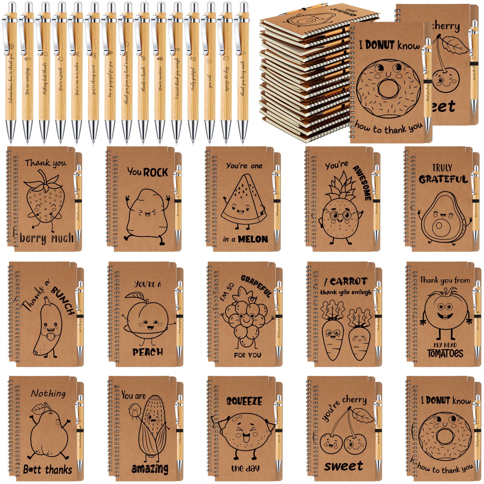 Geyoga 60 Pcs Employee Appreciation Gift Thank You Gifts Spiral Kraft Notebooks Sets with Bamboo Pens Fruit Pun Greeting Motivational Notebooks 5.5''|Office Supplies