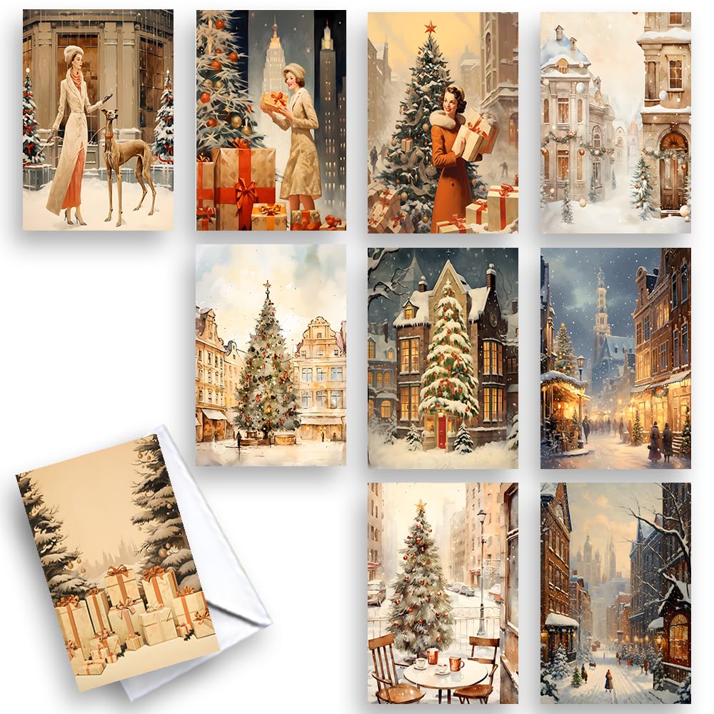 Wright Home & Gift Vintage City Scenes Christmas Note Greeting Cards | 10 Pack Assortment Bulk Variety Set + 10 Envelopes (4x6)|Office Supplies