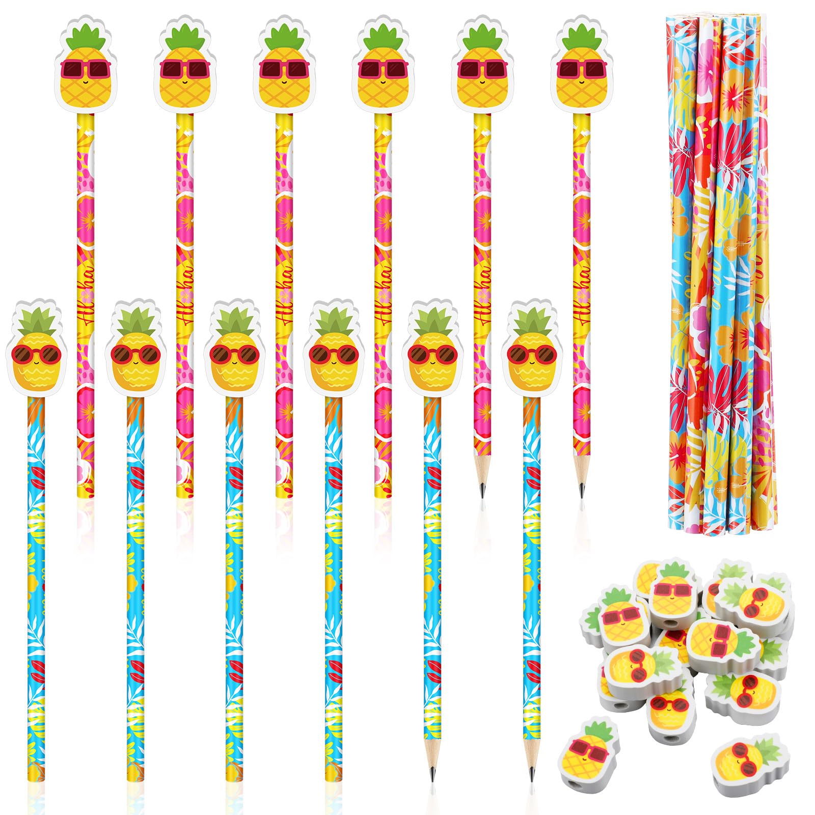AmazingSpark 32 Pcs Tropical Pencil with Pineapple Eraser Topper Colorful Fun Wood Pencils Summer Hawaiian Hibiscus Supplies Beach Party Decorations|Office Supplies
