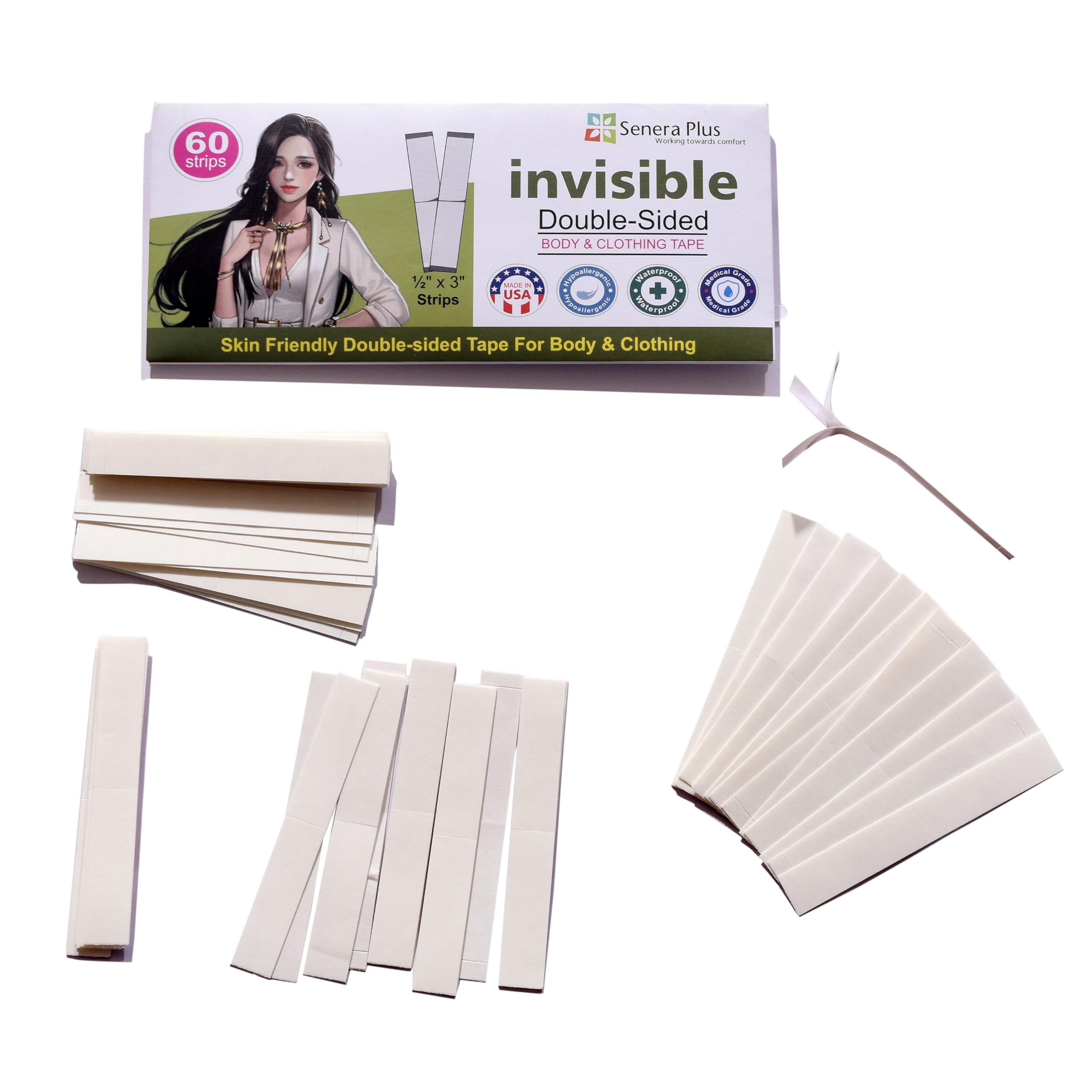NO WORRIES ABOUT EMBARRASSING SLIPS OR DISCOMFORT: Keep your clothing in place without the worry of embarrassing slips or discomfort. Our double-sided lingerie tape is the perfect solution for any occasion. SKIN FRIENDLY: Our skin-friendly, hypoallergenic adhesive is gentle on the skin, so you can wear it with confidence. FABRIC FRIENDLY: Preserve the integrity of your clothing and fabrics by avoiding the damage caused by metal pins. Our double-sided tape is designed to be invisible to others, with no unsightly lumpy marks or lines that can appear with pins. Our specially formulated adhesive is gentle on fabrics, ensuring that it won't leave any residue on your clothing after removal. With our fabric-friendly tape, you can keep your clothes looking new and stylish, wear after wear. SECURE YOUR FASHION STULE: Keep your fashion style secure with our long-lasting lingerie tape, perfect for quick repairs of fashion problems without the need for sewing or pins. With our tape, your clothing will stay in place and secure all day or night, giving you peace of mind and allowing you to focus on looking your best. PERFECT ADDITION FOR YOUR WARDROBE: Perfect for use on lingerie, swimwear, dresses, and more, with a discreet, clear design, our fabric tape is virtually invisible, allowing you to wear your favorite outfits without any unsightly straps or closures. Our versatile fabric tape for fashion is a must-have addition to any wardrobe. Clothing tape is an ingenious solution for keeping your outfits in place and looking polished. This double-sided adhesive tape is designed to discreetly secure clothing, preventing wardrobe malfunctions and ensuring a flawless fit. Whether you're struggling with a gaping neckline, a billowing skirt, or a shirt that just won't stay tucked, this tape has got you covered. Its strong yet gentle adhesive holds fabrics together without damaging delicate materials. Simply apply a strip between the layers of clothing you want to keep in place, and voila! Your outfit will stay put, allowing you to move with confidence. Compact and portable, this clothing tape is a must-have accessory for any fashion-conscious individual. Bid farewell to constant adjustments and embrace a seamless, worry-free style.