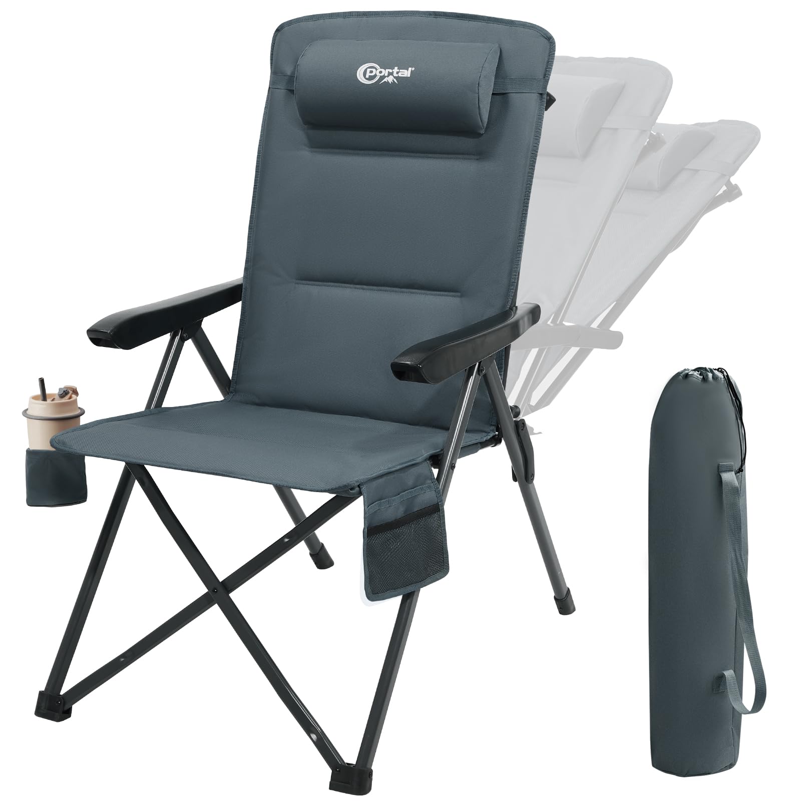 Comfortable Reclinging Camping Chair: This reclining lawn chair provides 3-level positions with 105-140 degrees via adjusting the hard armrest. The reinforced back support bar and removable pillow provides enhanced comfort for extended relaxation, whether reading or napping 28" High Back with Strong Support: Your shoulders and back will be fully supported by the tough polyester fabric. So you'll still feel cozy after a long time sitting in it, giving you the most comfortable experience and relaxedly enjoying the outdoor time Oversized and 400lbs Load-bearing: Designed with 23 inches width and 400lbs capacity, high density polyester fabric and thick-walled steel frame are used in this outdoor camping chair, all these features to ensure enduring strength, you can absolutely trust it with long term use Compact, Portable and Easy to Fold: This camping chair can be folded into a bundle and placed in the carrying bag within a few seconds. In addition, the shoulder strap on the chair frame allows you to move quickly and neatly without having to pack it in advance. You can easily bring it to camp, concerts, soccer games, outdoor sports, etc. Easy to Stand Up: With hard armrests and a high seat, this folding lawn chair lets you sit and rise effortlessly. Built-in pillow, cup holder and side pocket keep drinks and essentials within reach, adding convenience to any outdoor adventure.