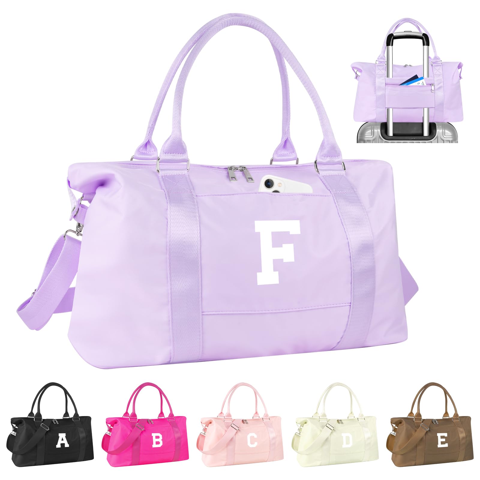 【Thoughtful Personalized Gift】Initial Travel Duffel Bag is a versatile gift choice, suitable for kids, girls, boys, teens and women. Customized with initials, giving this printed letter bag a unique meaning. Duffel bag is designed to be a nice carry-on compliant bag for airline travel. These travel bags are 21 letter styles, you can choose the style you like. It's also an ideal gift for friends, lover, mother, daughters, family, Valentine's Day, Thanksgiving, Halloween or Christmas gifts. 【Airplane Friendly Carry on Bag】Duffle bag size: 19.7 "Lx6.7" Wx11.8 "H, weight: 1.6lb, large capacity enough to even fit in 2-3 days of daily essentials, keep your personal items organized. Travel duffel bags for women are spacious enough to fit your cell phone, laptop, shoes, toiletries, umbrella and more. Lightweight carry-on bag fits effortlessly under airplane seats or overhead bin. Whether it's for business trips or leisure vacations, this travel bag will become your reliable companion. 【Dry Wet Separated Gym Bag】Gym bag is made of waterproof nylon fabric, durable and tear-proof. Gym bag has 1 large waterproof PVC lined zipper pocket and 2-slot pockets inside, used to separate dry and wet items such as clothes, towels, and swimsuits. The front of the travel bag has 1 open pocket that can hold tissues or small items. The back of the bag has 1 zippered pocket for easy access to mobile phones or passports during exercise or travel. Keep everything organized and easy to access. 【Adjustable Shoulder Strap & Trolley Sleeve】Travel duffel Weekender bags come with a comfortable removable adjustable shoulder strap and two attached handles. The fashion travel gym bags offer handheld, shoulder, cross-body carrying options to meet your different needs in different scenarios and personal preferences. Luggage strap on the back of the monogram overnight bag can be inserted and secured to the handle of the luggage, freeing your hands on a trip, making it ideal for travel. 【Multi-functional Use】This sports fitness bag has a simple appearance. There are many styles for you to choose from. Perfect for a travel duffle bag, weekender bags for women, overnight bags for women, hospital bag for women labor delivery, carry on bags for airplanes, gym bag for women, yoga bag, sport bag or dance bag. But also as a men's sport gym bag and travel bag. Travel duffel bags suit travel, sports, weekend getaways, gym sessions, beach outings, business trips, and everyday use. Dance Gym Duffel Bag Gifts for Girls Teen,Personalized Initial Travel Weekender Bag Cute Overnight Carry On Cheer Dance Duffle Bagfor Women,Sports Travel Monogram Birthday Christmas Gifts(Purple, F)