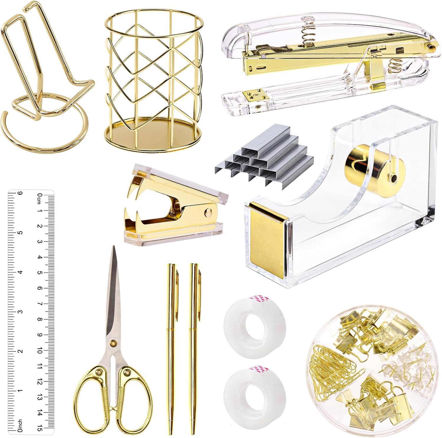 【13 in 1 gold office supplies set】:1 x pen holder,1 x phone holder,1x tape holder,1x stapler,1x scissor,1x staple remover,1x box of binder clips,1000x staples,2x Ballpoint Pen,2xClear Tape,1x ruler,This gold office set is rich in content and perfect for your desk, improving your productivity and making your office convenient and efficient. 【Premium Material】: gold desk accessories is smooth and comfortable to touch, not easy to break or deform, durable, elegant and beautiful,attach Bright colors easy to find,very suitable for daily work and study life. It can not only help You save time and increase productivity, but you can always keep your desktop clean and organized. Say goodbye to the days of hunting for misplaced stationery or fumbling with tangled work. 【Wide Range of Use】: Our gold desk accessories are practical and beautiful, This office supplies set includes several of the most commonly used work and study tools, suitable for many occasions. Elegant colors and designs will make your desk luxurious, clean, bright and relaxing.The rich combination office desk supplies can meet your daily office needs. Let you enjoy the ease and pleasure brought by the lovely and unified colors in your work. 【Easy To Carry】:You can put these gold desk accessories in the drawer or desk at will, it won't take up too much space. The clips are equipped with a lattice storage box for easy organization use and storage.You can also put school supplies set in your handbag or schoolbag and take them anywhere. It enhances the aesthetics and modernity of your office while keeping your desk tidy and organized. 【The perfect gift】: this gold stationery set is not only suitable for personal use, but also very suitable as a gift for family, friends, and colleagues.very suitable as Christmas gifts, birthday gifts, Thanksgiving gifts, back to school gifts for women, students, coworkers, office clerks, teachers, teens. sticky notes desk organizer desk accessories stapler office desk accessories office supplies binder clips ruler pen holder for desk staplers for desk pen holder desk organizers desk organizers and accessories office accessories pencil holder desk accessories for women office supplies for desk desk organization staplers desk decor for women office supplies for women desk supplies gold desk accessories gold office supplies acrylic desk accessories desk set gold desk organizer desk supplies for women office aesthetic office supplies set staple gold office decor gold stapler paper clips and binder clips gold scissors office desk decor for women gold office accessories gold pen holder desk sets and accessories desk stapler desk accessories set office supply set gold tape dispenser stapler set oficina cute desk accessories for women office desktop stapler desk supplies set gold desk accessories for women office gold desk decor gold pen holder for desk gold scissors for office desk staples remover office desk set office desk accessories set gold stapler and tape dispenser set clear stapler tape and stapler desk set gold office desk accessories