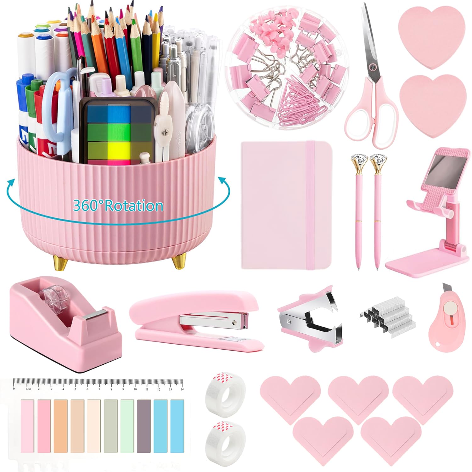【22-in-1 Office Supplies Set】1x 360° Desk Organizer, 1x Foldable Phone Stand for Desk, 1x Tape Holder, 1x Stapler, 1x Scissors, 1x Staple Remover, 1x Box of Binder Clips, 1000x Staples, 2x Ballpoint Pens, 2x Sticky Notes, 2x Clear Tape, 1x Index Tabs with ruler, 1x Mini Utility Knife, 1x Journal Notebook, 5x Bookmarks.This purple office set is rich in content and perfect for your desk, improving your productivity and making your office convenient and efficient. 【360° Rotation Design】This desktop pen holder can be rotated 360 degrees. Divided into 5 compartments, it rotates smoothly and will not get stuck. You can rotate it to any angle to easily store or take out the items you need, which is very convenient and fast. Not only can it help you save time and increase productivity, but it also helps you keep your desktop clean and organized. Say goodbye to the days of hunting for misplaced stationery or fumbling with tangled work. 【Wide Range of Use】Our desk accessories are practical and beautiful. This office supplies set includes several of the most commonly used work and study tools, suitable for many occasions. Elegant colors and designs will make your desk luxurious, clean, bright, and relaxing. The rich combination of desk supplies can meet your daily office needs. It lets you enjoy the ease and pleasure brought by the lovely and unified colors in your work. 【Easy to Carry】You can put these desk accessories in the drawer or on the desk at will. It won't take up too much space. The clips come with a lattice storage box for easy organization and storage. You can also put this office supplies set in your handbag or schoolbag and take them anywhere. It enhances the aesthetics and modernity of your office while keeping your desk tidy and organized. 【The perfect gift】This stationery set is not only suitable for personal use but also very suitable as a gift for family, friends, and colleagues. It is also ideal as Christmas gifts, birthday gifts, Thanksgiving gifts, back-to-school gifts for women, students, coworkers, office clerks, teachers, and teens. desk accessories office supplies set desk accessories pink stapler and tape dispenser set stapler and tape dispenser set stapler and tape dispenser set stapler set desk set stapler and tape dispenser set with staple remover tape and stapler set ruler holder desk supplies desk accessory office supplies office supplies pink desk accessory kit stapler holder office supply set office supplies and accessories office supplies desk accessories desk set desk sets and accessories for women office desk accessories set desk supplies set desk accessories set pink desk supplies for middle school desk accessories tape dispenser tape dispenser desk organizer desk accessories for women office desk accessories mini school supplies desk accessories for office desk supplies school supplies cute desk accessories mini school supplies kit staplers for desk cute desk accessories office decor office desk accessories for women mini stationary kit mini tape dispenser staple remover staples stapler heavy duty tape dispenser desk desk organization office desk accessories school supplies mini office supply kit pen organizer for desk desk organizer set school supplies aesthetic scotch tape dispenser pink stapler pen holder for desk aesthetic grad school essentials boho desk accessories school supplies cute school supplies for teen girls office accessories desk organizer rose pink stapler cute school supplies aesthetic desk accessories aesthetic office desk accessories pink desk organizers and accessories office supplies 360° rotating marker organizer office supplies for desk cute tape dispenser college supplies stapler with staples organizer for desk desk supplies for women office aesthetic desk accessories set back to school supplies aesthetic paper organizer kids desk accessories cute stapler desk organizers and accessories pink bling pink desk accessories bling office accessories desk accessories & workspace organizers school accessories aesthetic office supplies teacher supplies office desk accessories aesthetic cute school supplies stapler set staple desk pen holder aesthetic desk accessories pencil dispenser for classroom office supplies kit desk stapler pink staplers for desk office supplies for desk middle school supplies 6th grade girls back to school hot pink office supplies office accessories for women stapler pink school desk supplies desk organizer pink rotating desk organizer rotating pen holder rotating art supply organizer desk decor set