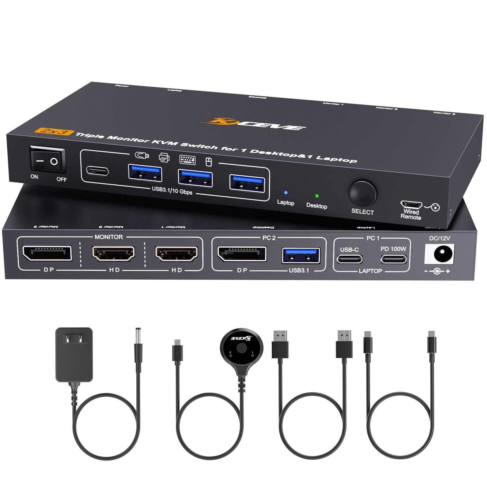 KCEVE USB 3.1 KVM switch allows you to seamlessly control 1 laptop and 1 desktop with just one set of peripherals: a keyboard, mouse, and three displays (HDMI + HDMI+ DisplayPort). Whether you're working from home, in the office, or managing multimedia devices. The laptop only requires one USB-C cable, and the desktop only requires 1 DisplayPort cable and 1 USB cable.
