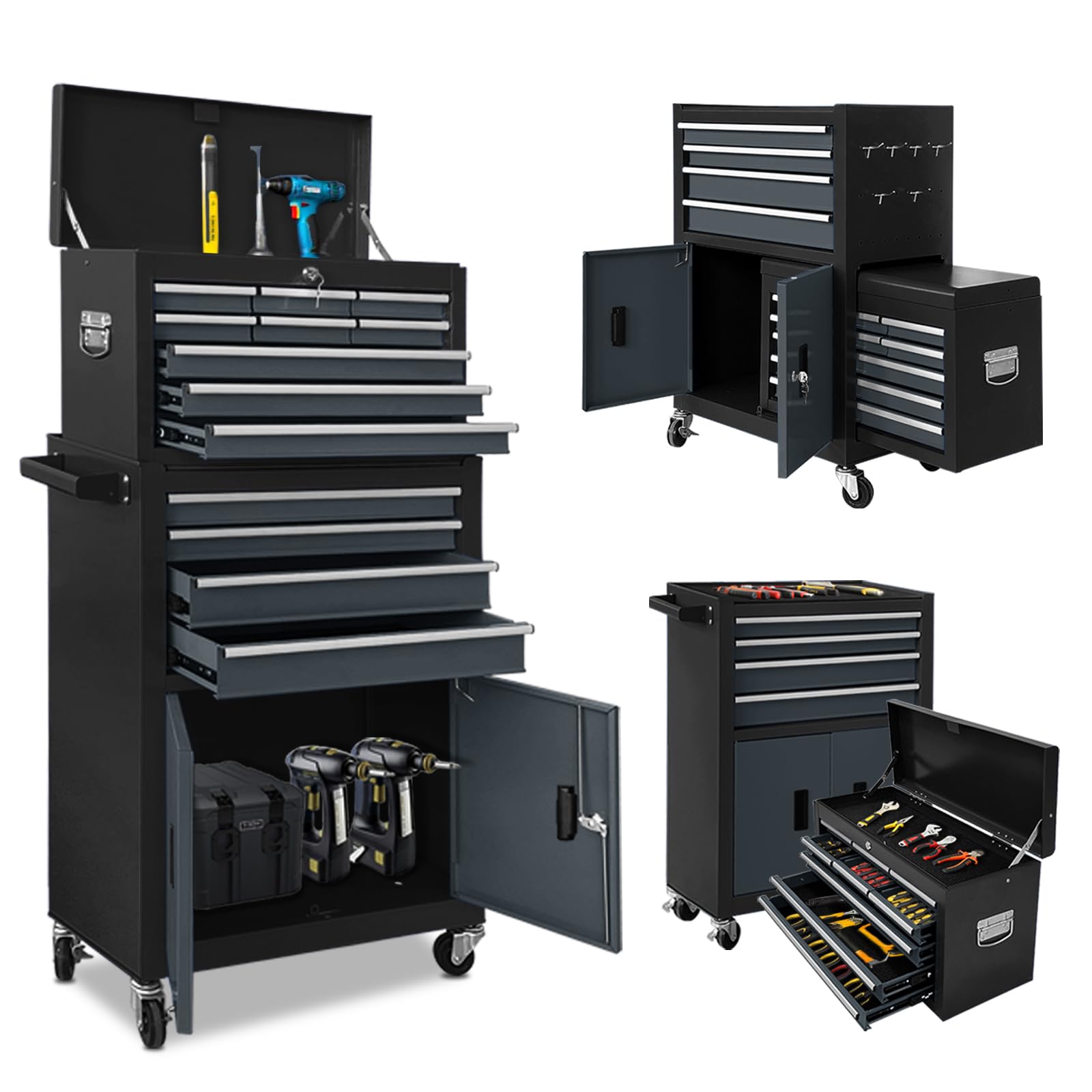 【Detachable 2 In 1 Design】 This TAKUWA rolling tool chest consists of a top tool box and a base cabinet, which can be used separately or combined together for flexible storage. The top box fits perfectly into the base cabinet to save space, making it easy to transport and store in garages or workshops. 【Dual Safety Lock System】 Equipped with independent safety locks, this tool cabinet keeps your hand tools and power tools secure and prevents children from touching dangerous tools. The reliable locking design ensures drawers and cabinets stay closed during movement, avoiding accidental slips or falls. 【Heavy-Duty Steel & Durable Powder Coating】 Made of high-quality steel with a smooth powder-coated surface, this tool chest is sturdy, rust-resistant and easy to clean. It features strong load-bearing capacity with a maximum weight of 550lbs, stable enough for long-term heavy-duty use. 【360° Swivel Casters with Brakes】 Comes with 4 universal rolling casters (2 with brakes) for easy movement and stable fixation. A comfortable grip handle allows you to move the tool cart smoothly from garage to workshop or job site with minimal effort. 【13 Drawers & Large Organized Storage】 This tool cabinet includes 13 smooth drawers with ball-bearing slides and EVA liners to protect tools and reduce noise. It also comes with 2 cabinet doors, 4 hooks, and multiple storage holes for screwdrivers, wrenches, pliers and other small parts, keeping all tools well-organized and easy to find. The 13 drawer toolbox has a larger capacity compared to all other 8-drawer toolkits!!! Upgraded!!! tool chest has 6 small drawers,7 large drawers,1 top tool chest and 1 bottom cabinet. tool Chest can help you store your tools perfectly. Due to the different sizes of drawers, you can easily place the tools in the right drawer. The bottom of the toolbox has 4 wheels and handles on the side, so the toolbox can be easily moved. This toolbox can be placed in a house, garage, warehouse, etc. This is also an excellent gift for my boyfriend and father. You can also use it as a gift for Father's Day, Thanksgiving, and Christmas. How to assemble this toolbox: The top section were located in the cabinet on the bottom, remove some screws and the side panel and then it will slide out. You only need a screwdriver and assemble according to the instructions, no other tools are required.Top chest and bottom cabinet are detachable to meet your needs for separate use. Tips:In order to reduce the shipping box size,we will put the top tool box into the bottom storage. Customer service: If you are not satisfied after receiving the product, you can contact us at any time, we will provide you with satisfactory answers within 24 hours. Product specifications: Material: Steel Need to be assembled: instructions included Overall Dimension: 24.4"(L) x 13"(W) x 43.3"(H) Top Tool Chest Dimension: 23.6"(L) x 10.2"(W) x 13.8"(H) Bottom Tool Chest Dimension: 24.4"(L) x 13"(W) x 33"(H) Handle Length: 13”