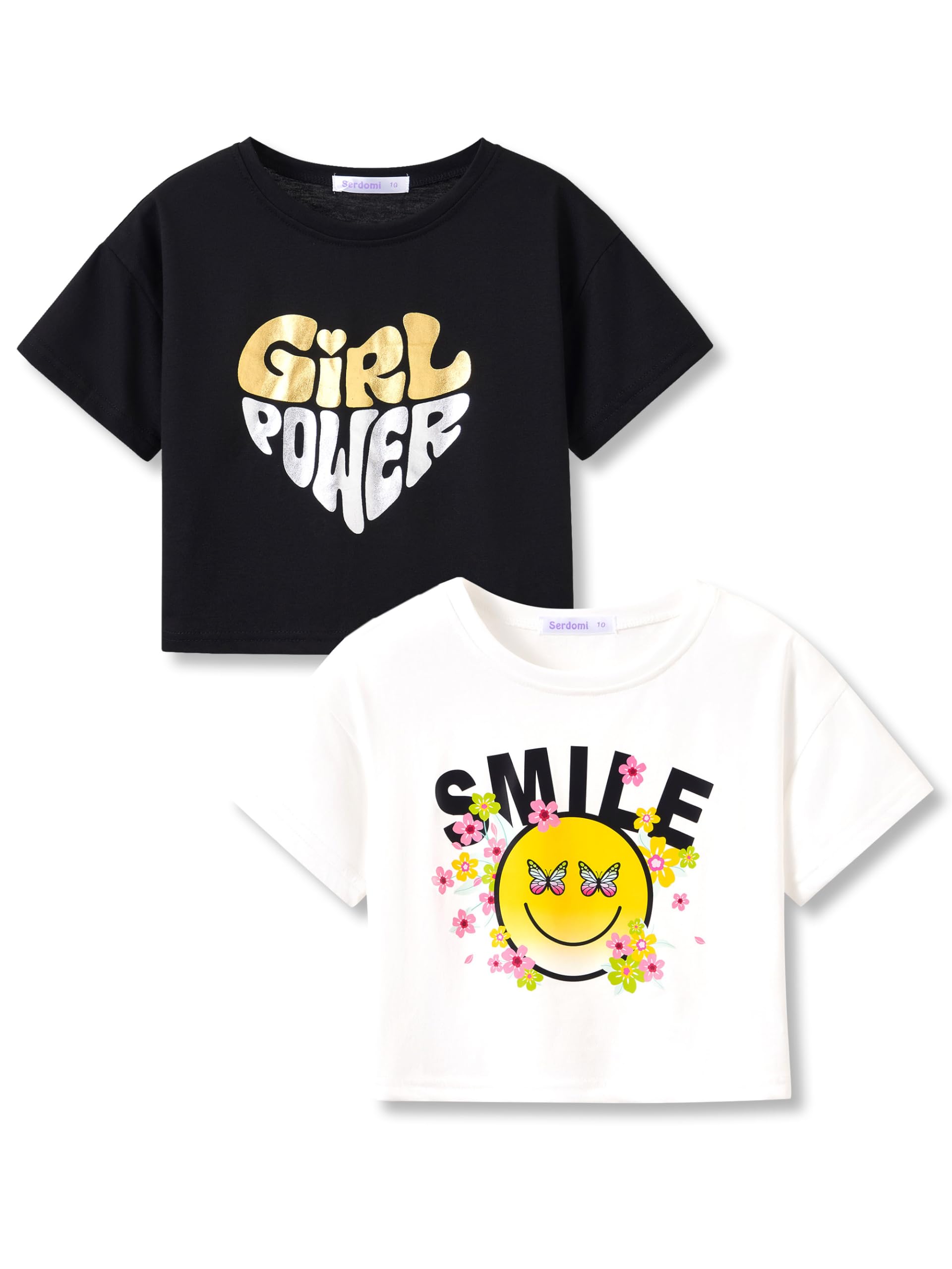 Serdomi Stylish Graffiti/Butterfly Graphic Crop Top for Girls -Cool Summer T-Shirt Soft Colorful 2-Pack Tees Size 6-18|Clothing