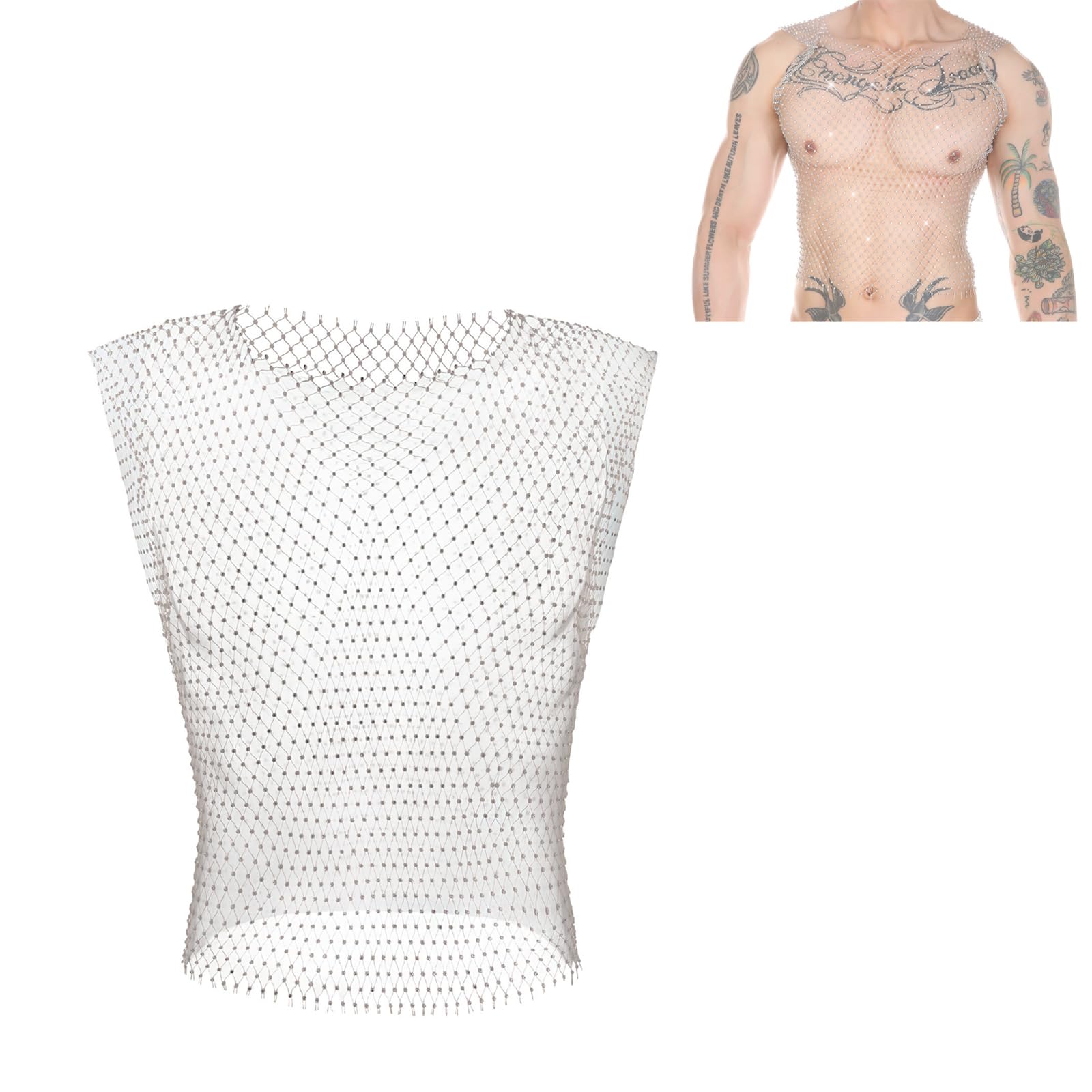GENEMEN Rhinestone Mesh Top Men Fishnet Tank Top Sexy Cropped Shirt Rave Sheer Vest|Clothing