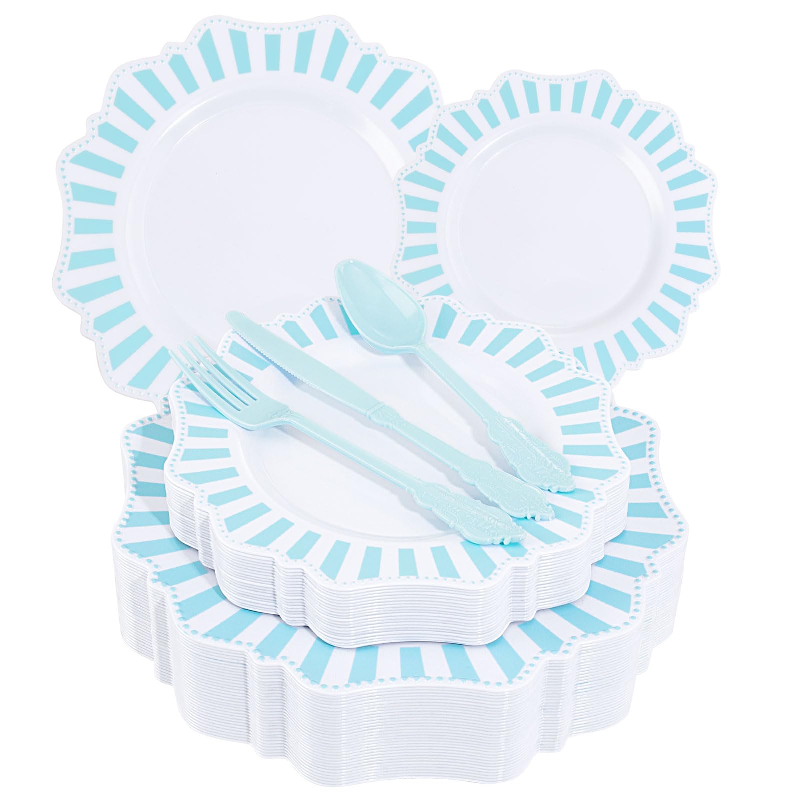 COLOSUS 150pcs Disposable Blue and White Striped Easter Plastic Party Plates and Silverware set, Light Blue Dinner/Dessert Plates silverware serve|Kitchen & Dining