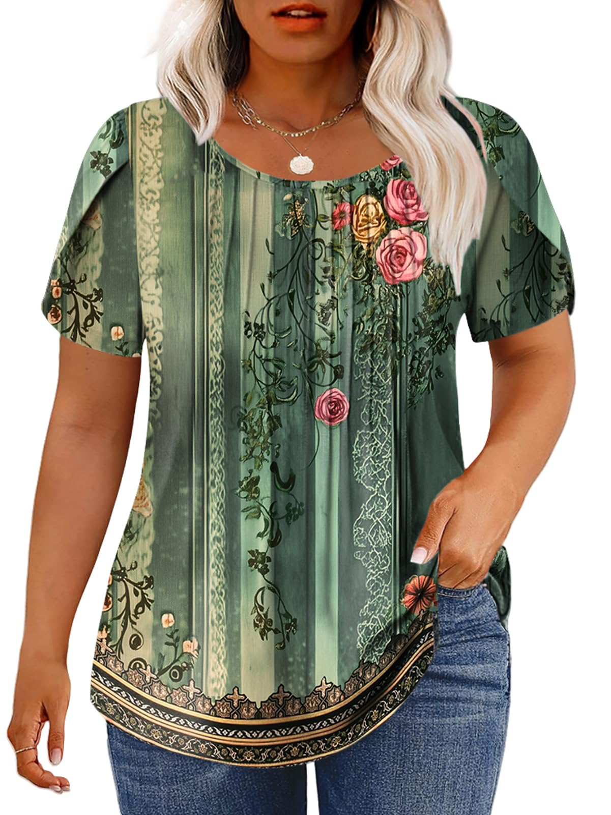 Womens-Plus-Size-Summer-Tops Trendy Petal Short Sleeve T Shirts Casual Crewneck Cute Flowy Pleated Blouses Tunics Tee|Clothing