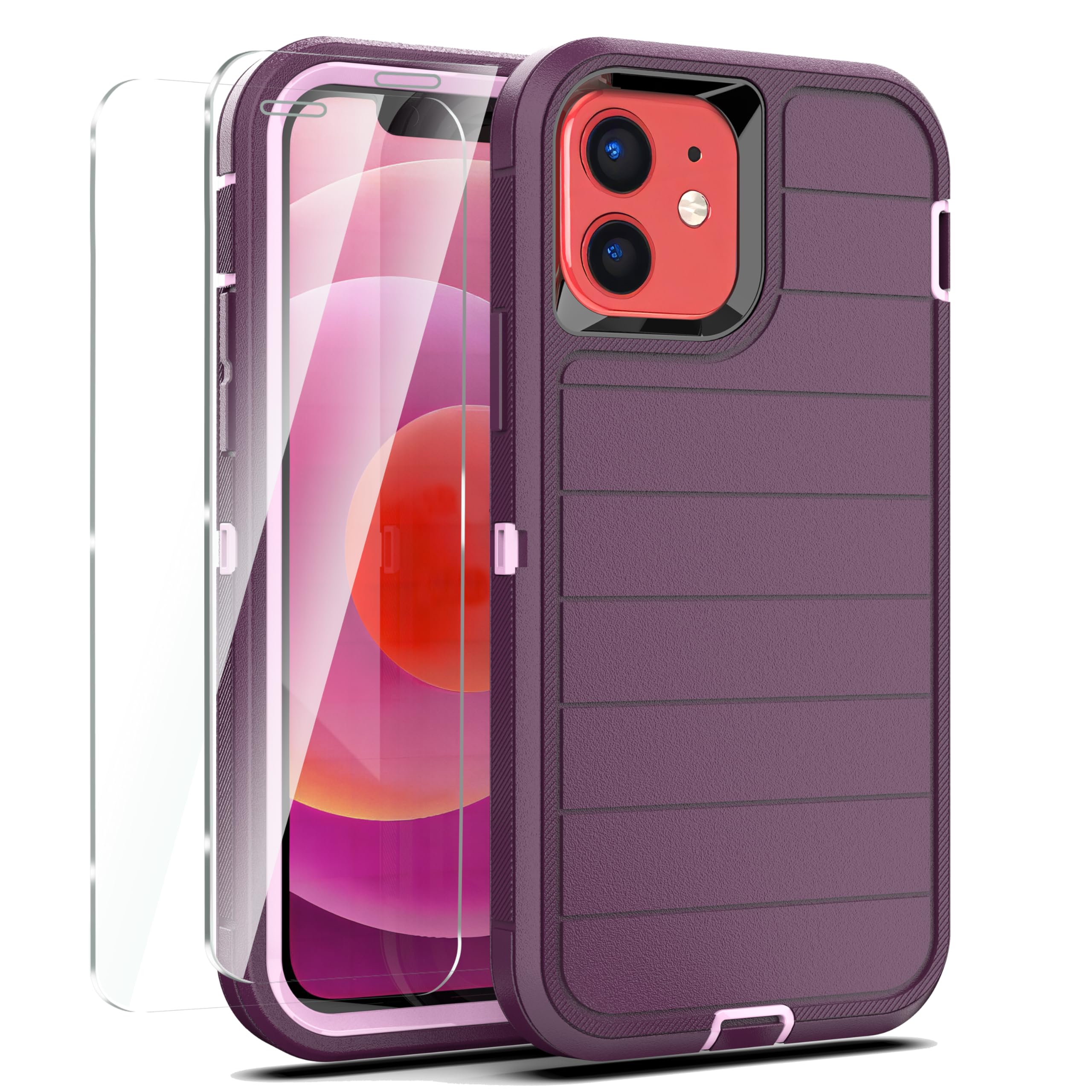 iPhone 12/12 Pro 6.1" Case - Drop Proof Tempered Glass Screen Protector (2 pcs) & Durable 3-Layer Cover with Solid Rubber Stripe - Wine Red/Rose Pink|Telephony