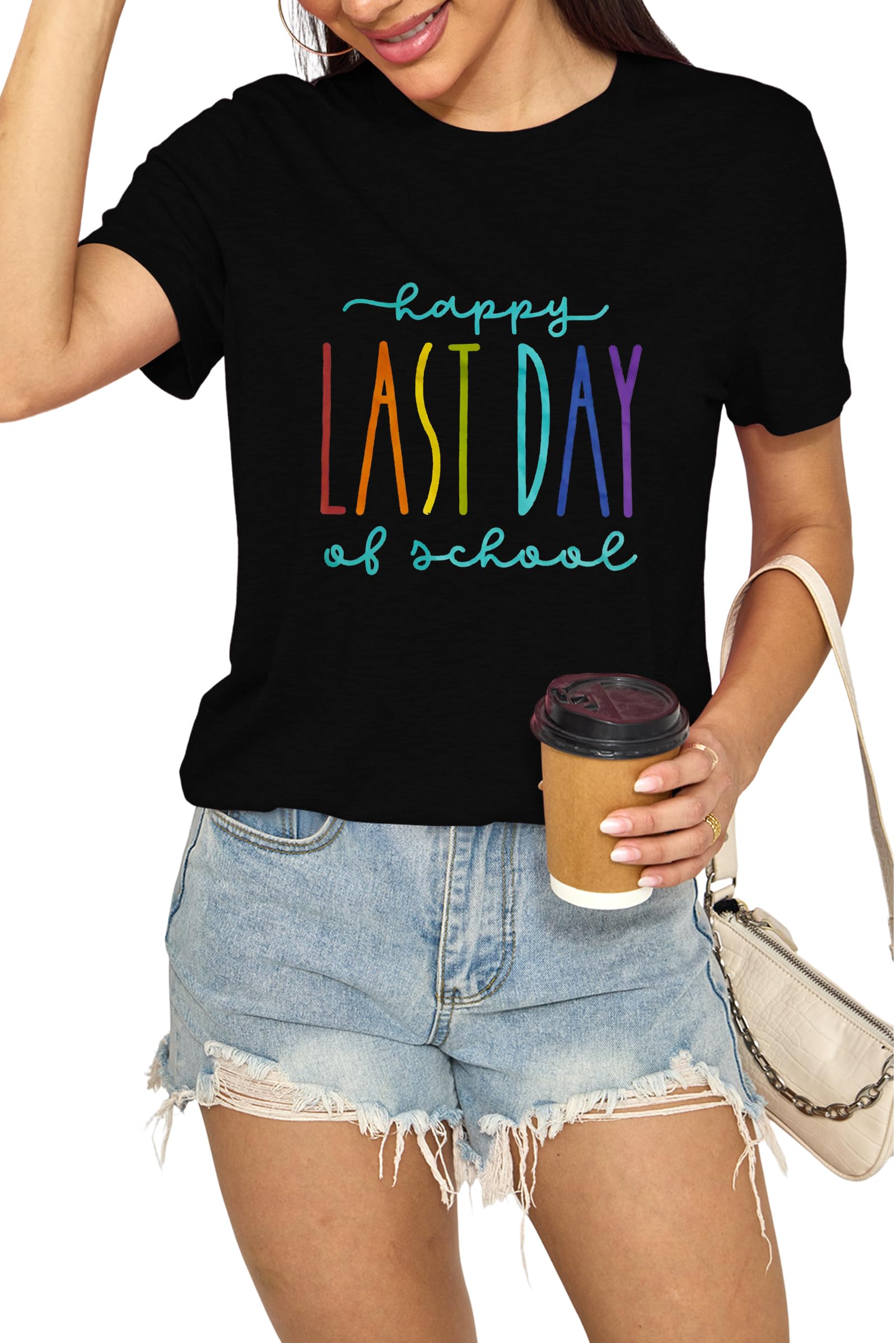 Happy Last Day of School Teacher Shirt with Soft Fabric - Rainbow - Colored Letter Print, Crew Neck and Short Sleeve|Clothing