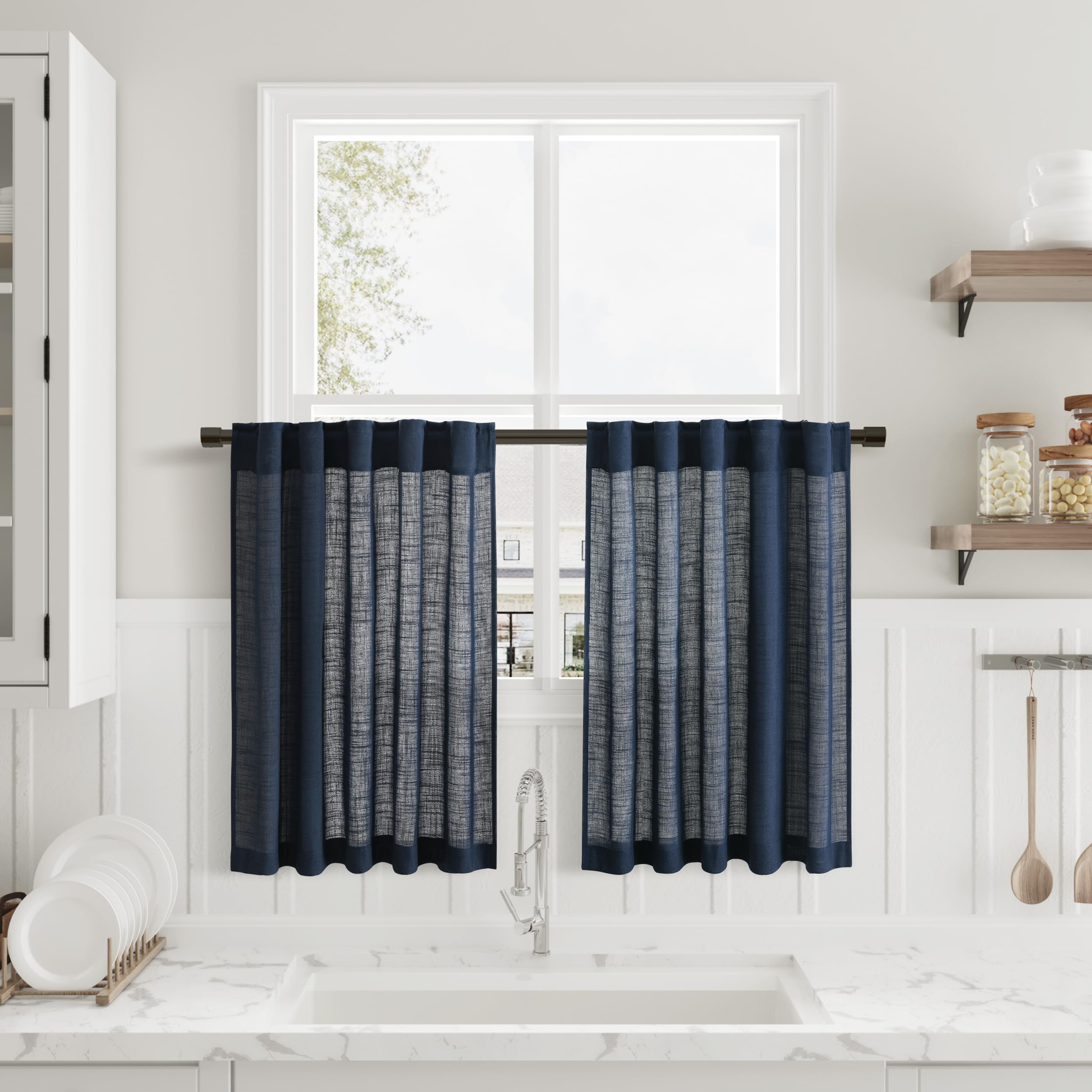 Nanspring Navy Blue Linen Cafe Curtains Linen Kitchen Curtain 24 Inch Length 2 Panels Semi Light Filtering Short Tier Drape with Back Tab Rod Pocket|Home & Garden