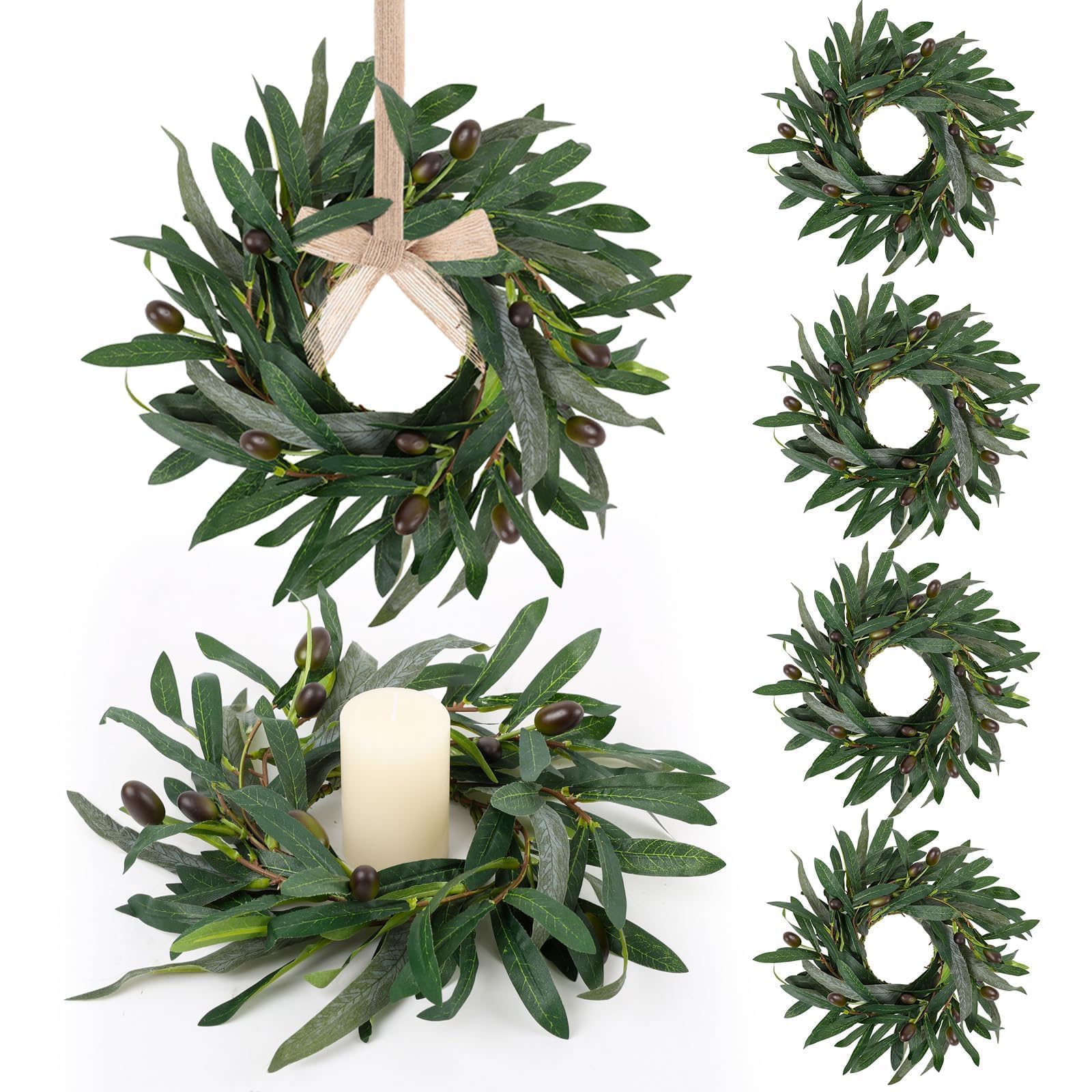 6 Pcs Artificial Spring Olive Candle Rings Wreaths Greenery Wreath with Olive Leaves Spring Summer Kitchen Cabinet Wreath for Pillars Farmhouse|Home & Garden