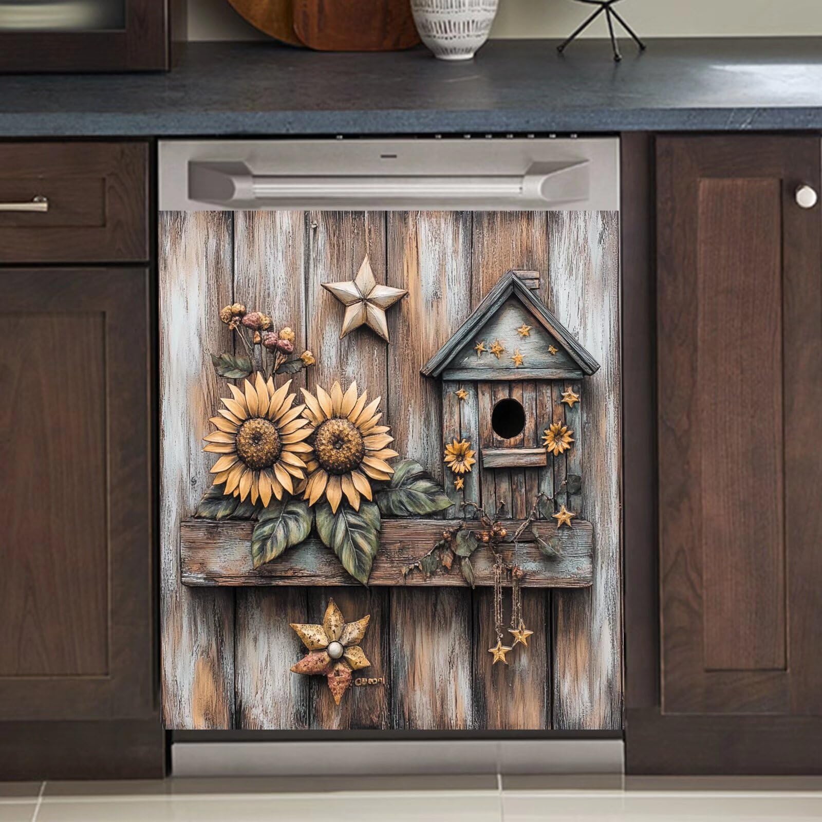 Rustic Wooden Sunflower Magnetic Dishwasher Cover Vinyl Decals, Vintage Log Cabin Pentagram Kitchen Decor Refrigerator Magnet Sticker, Dishwasher|Home & Garden