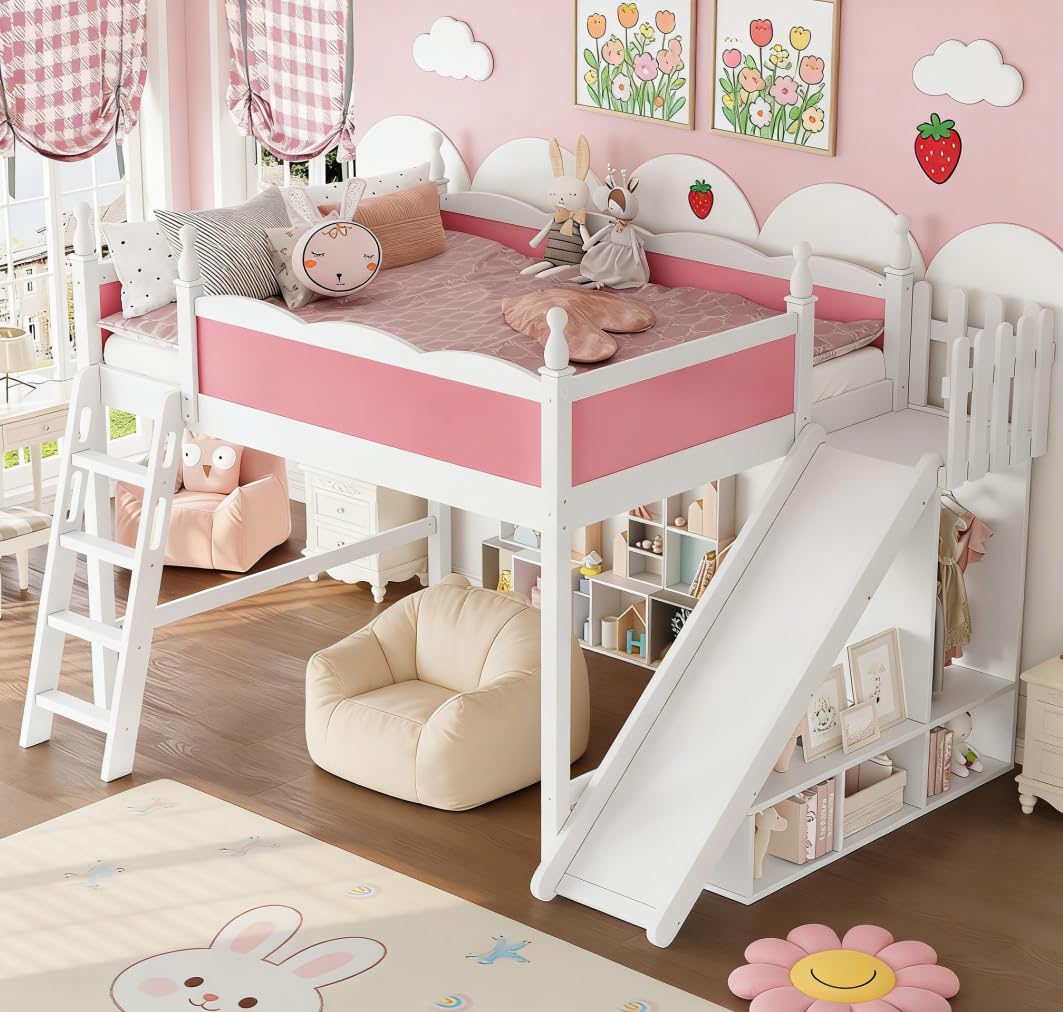 Bellemave Queen Loft Bed with Slide and Storage Shelves and Ladder for Kids, Wood bunk Bed for Boys Girls, White and Pink|Furniture