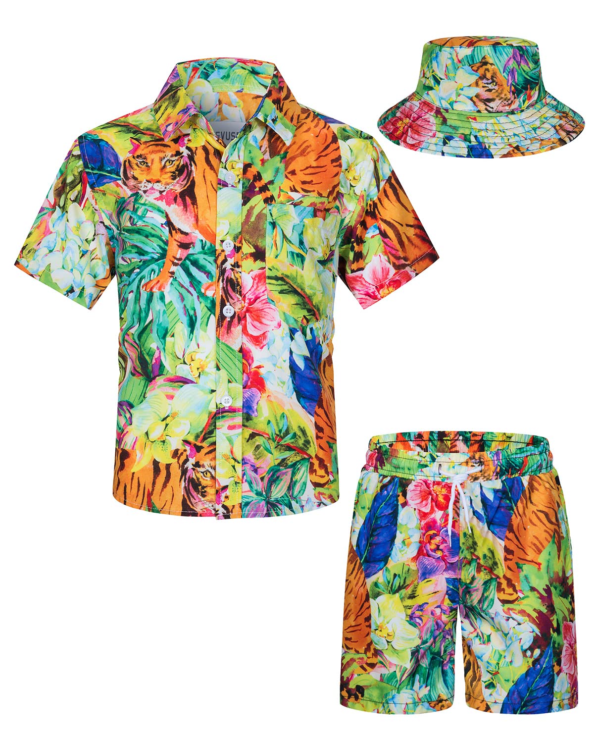 TUNEVUSE Little & Big Boys Hawaiian Button Down Shirts and Short Sets with Bucket Hat Summer Outfits Printed Kids Cabana Set|Clothing
