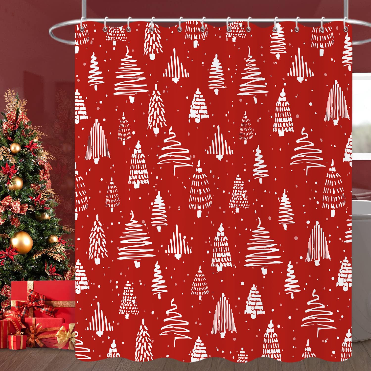 Caheansi Christmas Tree Shower Curtain, Red Merry Xmas Tree Snowflake Winter New Year Holiday Bathroom Curtain Waterproof Fabric Machine Washable with|Home & Garden